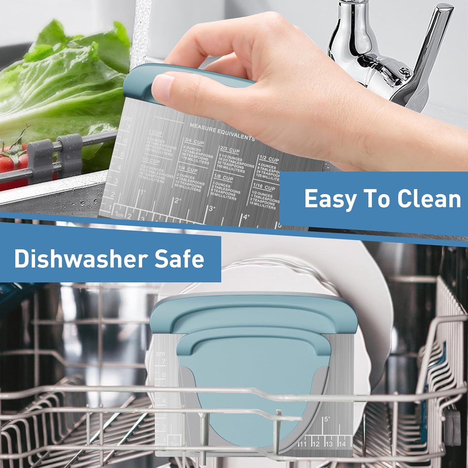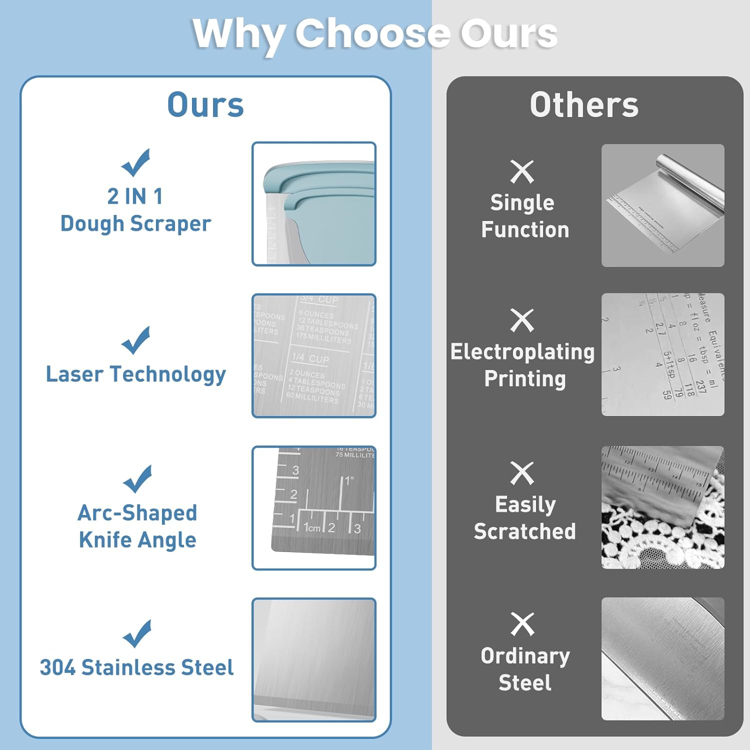 - 【Upgraded Design】This bench scraper kitchen has an ergonomic handle, prevents slipping and offers a firm and comfortable grip, minimizing hand fatigue during extended use. Food scraper stainless steel is designed with measurement markings and conversion chart which use advanced laser-engraved technology for easily measuring.