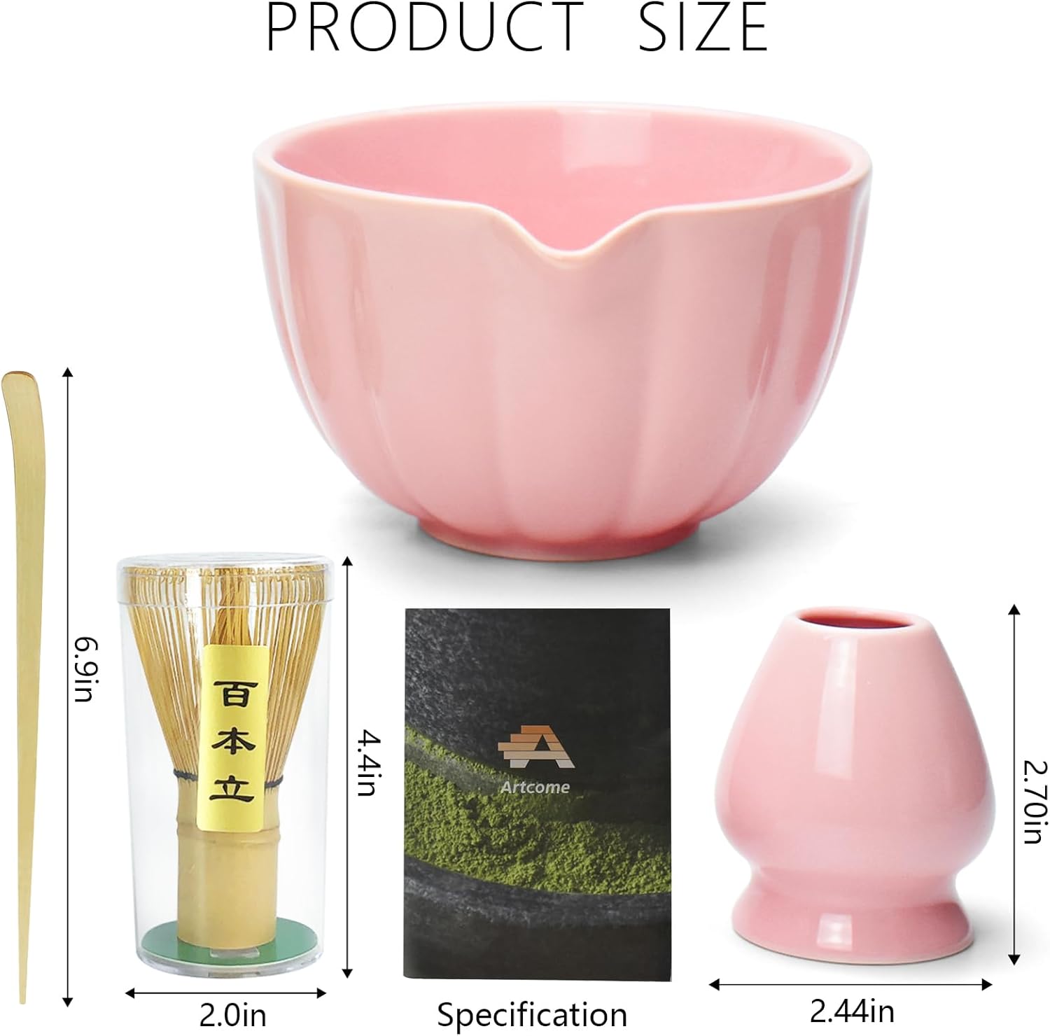 Artcome 4 Pcs Japanese Matcha Tea Set - Matcha Bowl with Pouring Spout, Matcha Whisk, Tea Scoop, Whisk Holder, Handmade Matcha Ceremony Kit For Japanese Tea Ceremony, Rose