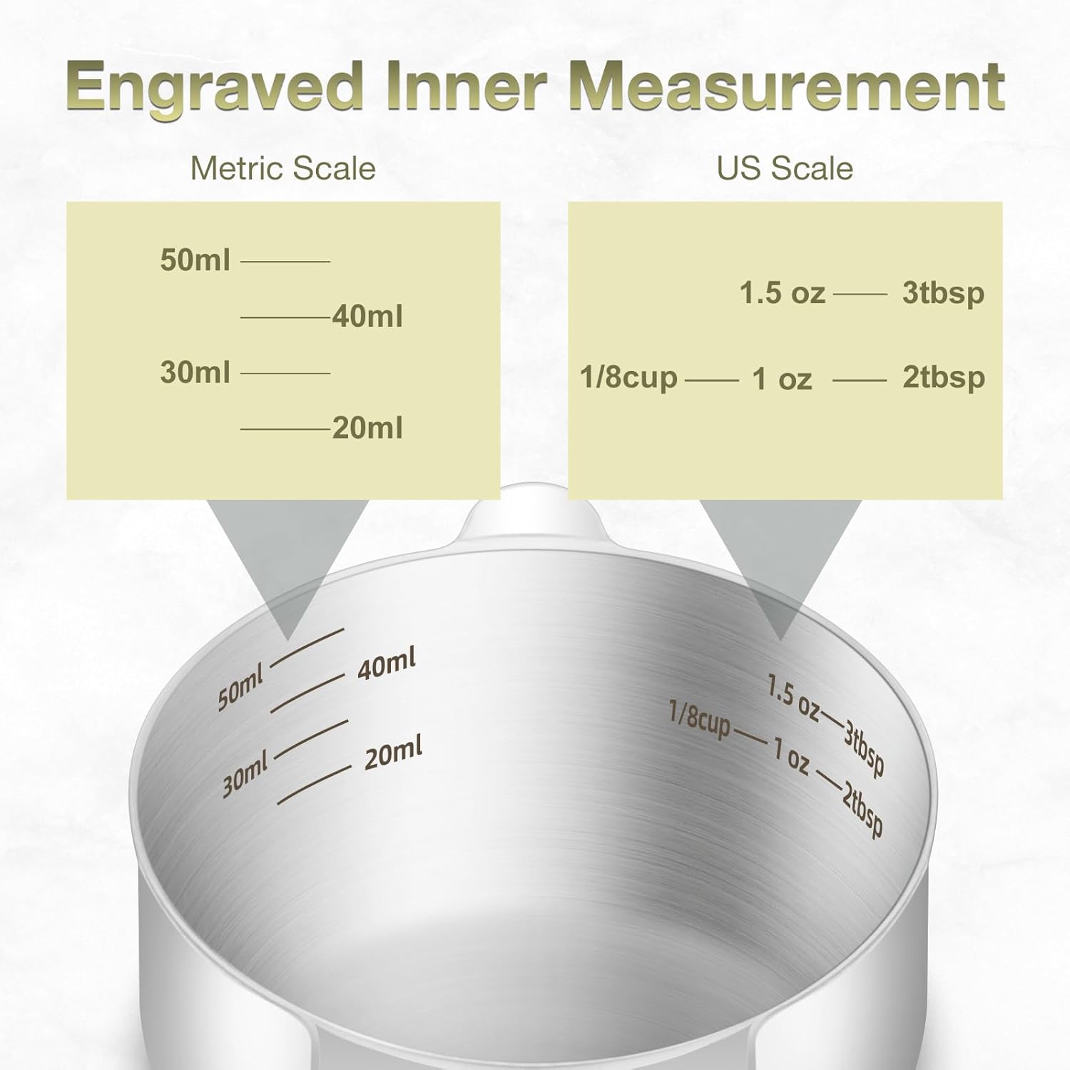 - Dual Scales Available - Engraved clear and accurate METRIC & US scales on the inner side will never fade and can be seen forever. It can meet different needs and let you know the amount to add in every time. The all measurement contains 1/4cup(2oz), 3tbsp(1.5oz), 2tbsp(1oz), 60ml, 50ml, 40ml, 30ml, 20ml