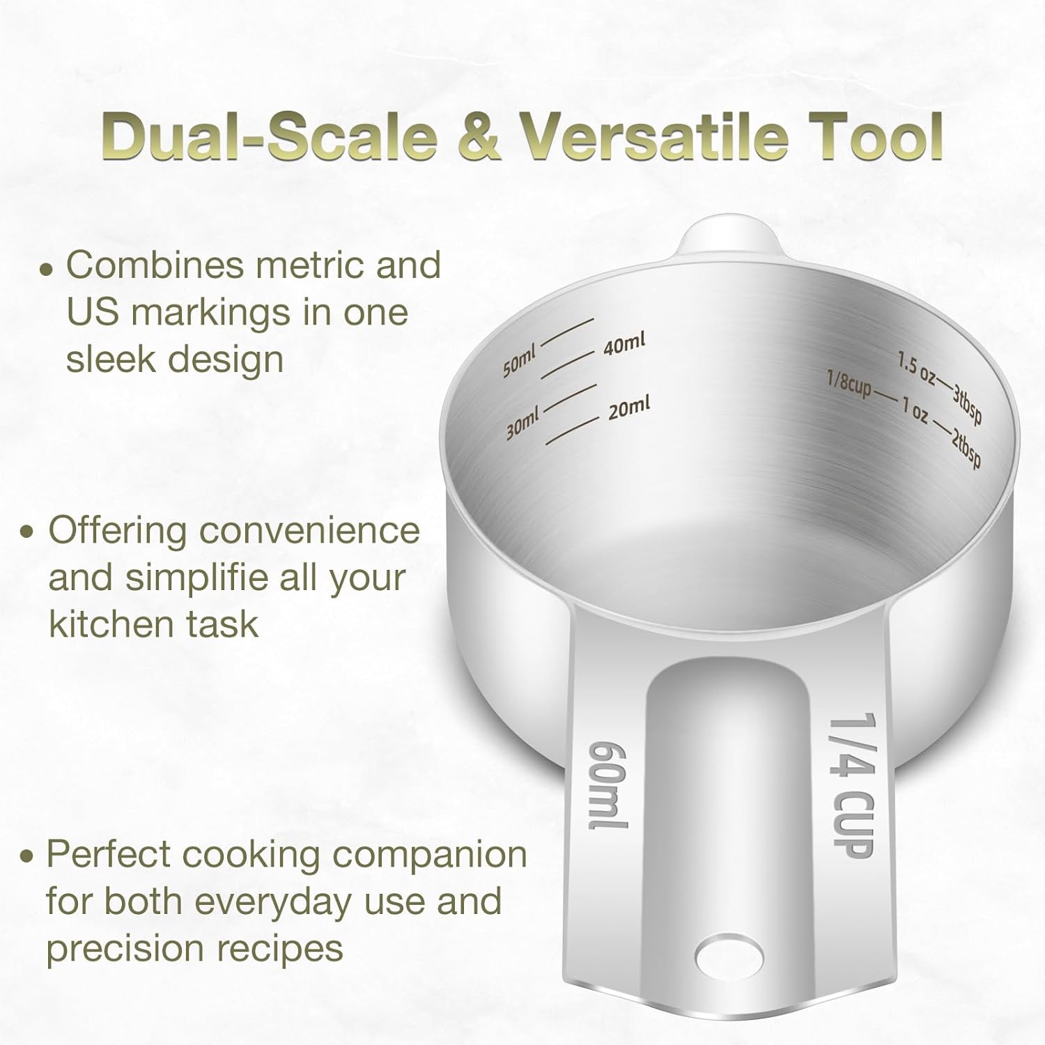 2PCS 1/4Cup (60ml, 2oz) Single Measuring Cup, Etched Inner Scale Stainless Steel Measure Scoop, Metric and US Measurement, Dishwasher Safe