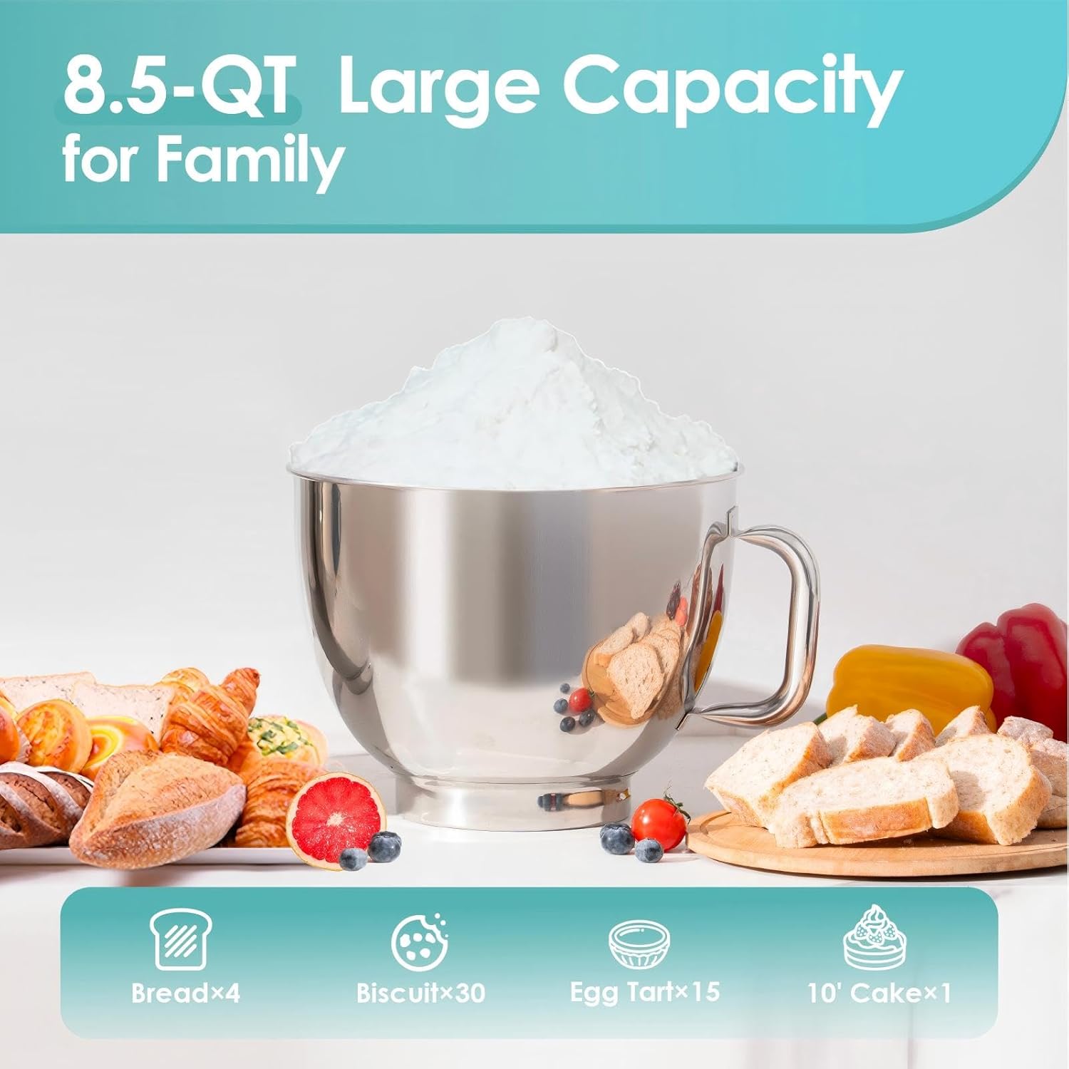- 8.5 QT High Capacity: Our stand mixer comes with an 8.5 QT stainless steel bowl, providing ample space for preparing large batches of dough, batter, or mixtures. It's ideal for family meals, gatherings, and large-scale baking projects. The convenient single-handle design allows for easy lifting and pouring with hands.