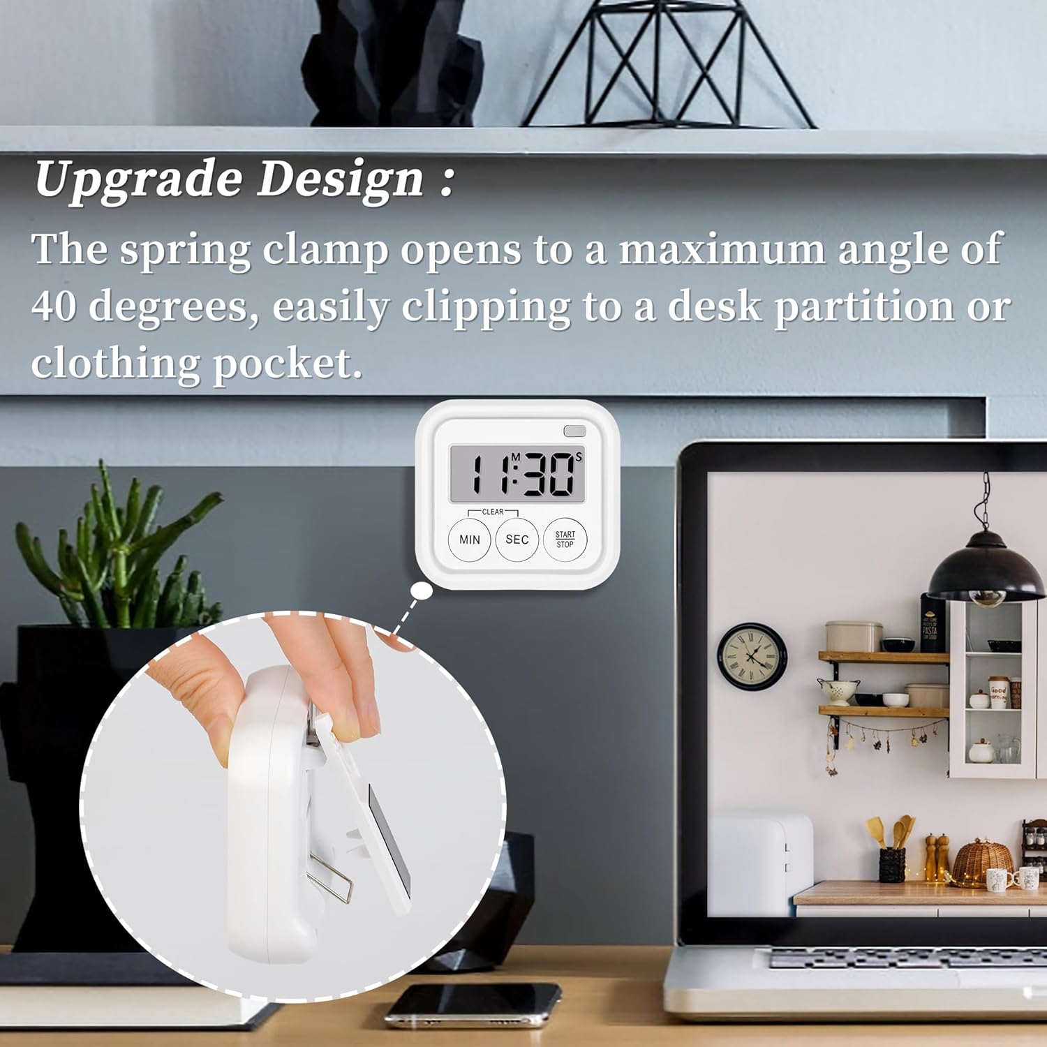 - New Upgrade: Strong back magnet/hanging hole/clip in one. Can be adsorbed on the refrigerator, oven, microwave; can be hung; can be clipped on the desk baffle, or even the clothes pocket. The bottom widened design is easily placed on the desktop.