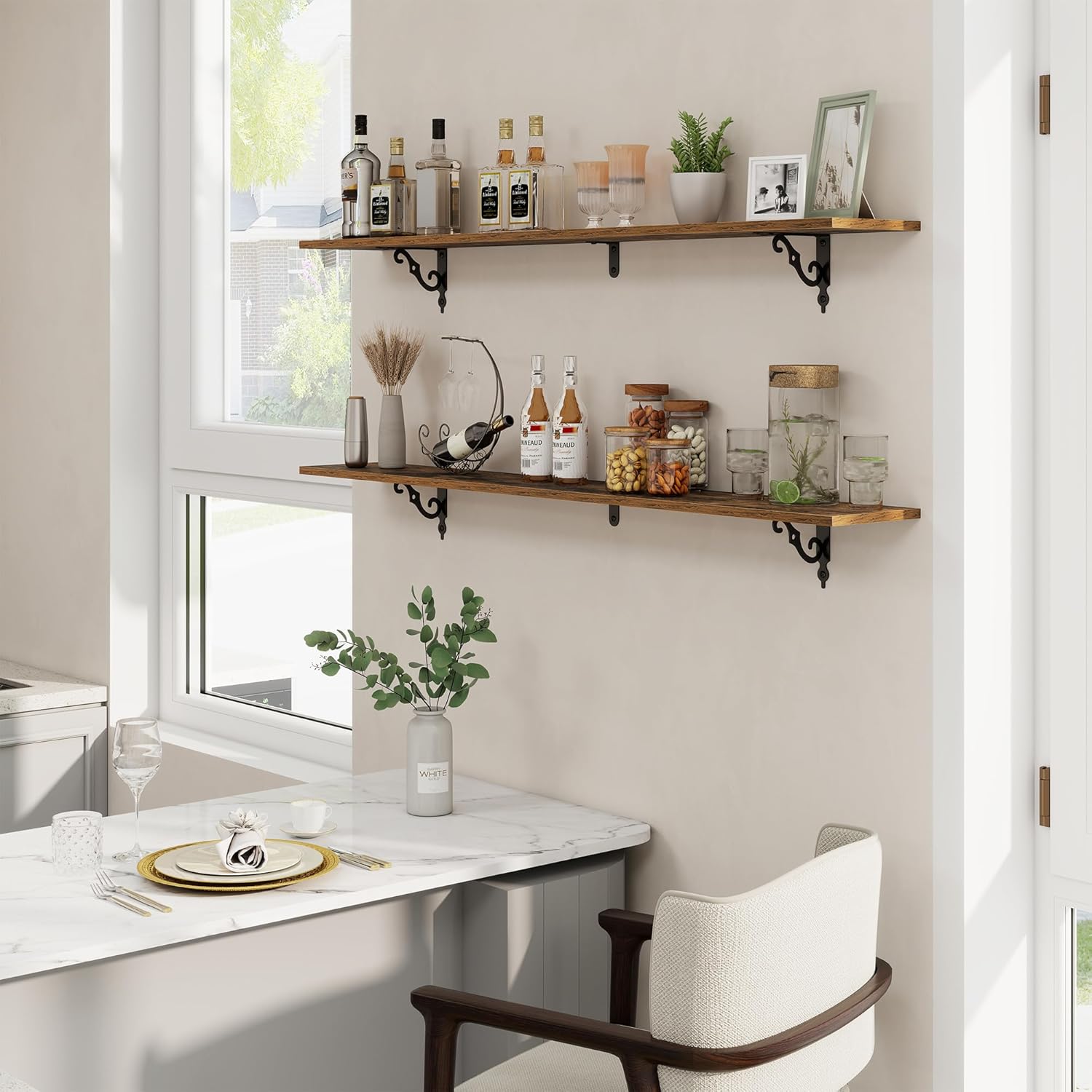 RICHFOCUS Floating Shelves for Wall Decor, 55.1W x 8D Wall Shelves Set of 2, 8 Inch Deep Rustic Wood Shelves Wall Mounted with Brackets, Long Shelves for Living Room Bedroom Kitchen, Rustic Brown