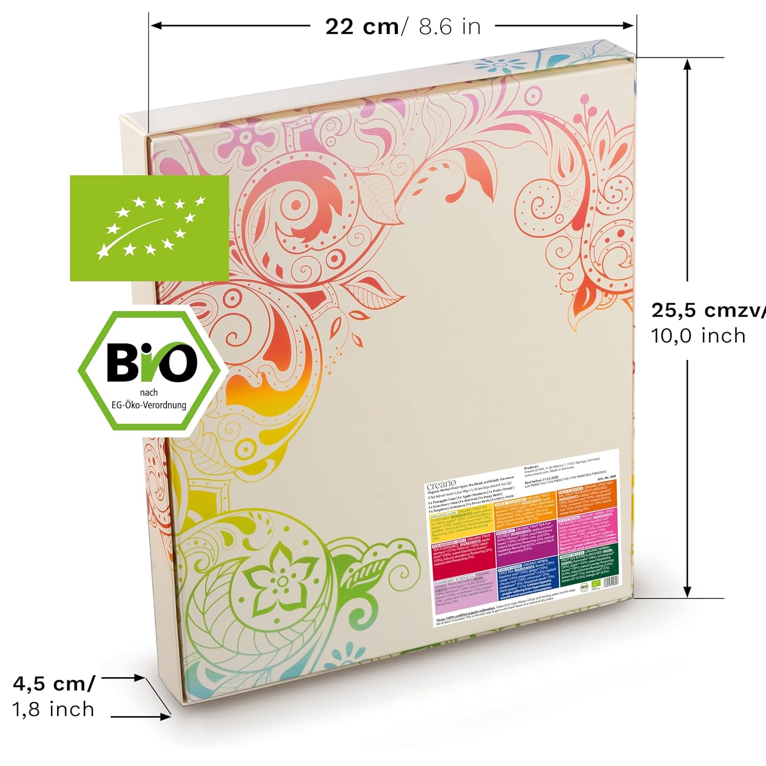 Creano Organic Fruit Tea Herbal Tea Gift Set – 45 Organic Tea Bags in 9 Dreamy Varieties – 90 g