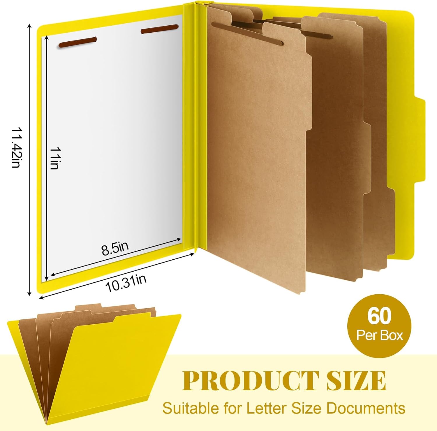 60 Pcs Classification Folders Letter Size, Back to School Supply for Teacher, Student, 3 Dividers Pressboard File Folder Bulk with 2 Fasteners, 3.5 Inch Expanding File Organizer (Yellow)