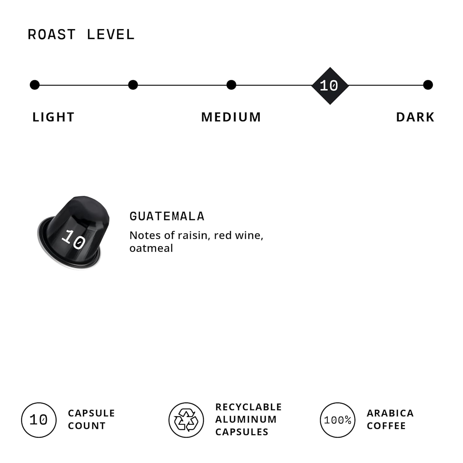 Atlas Coffee Club Espresso Pods Compatible with Nespresso Original– Dark Roast (10 Count)– Aluminum Capsules from Guatemala– Intensity 10