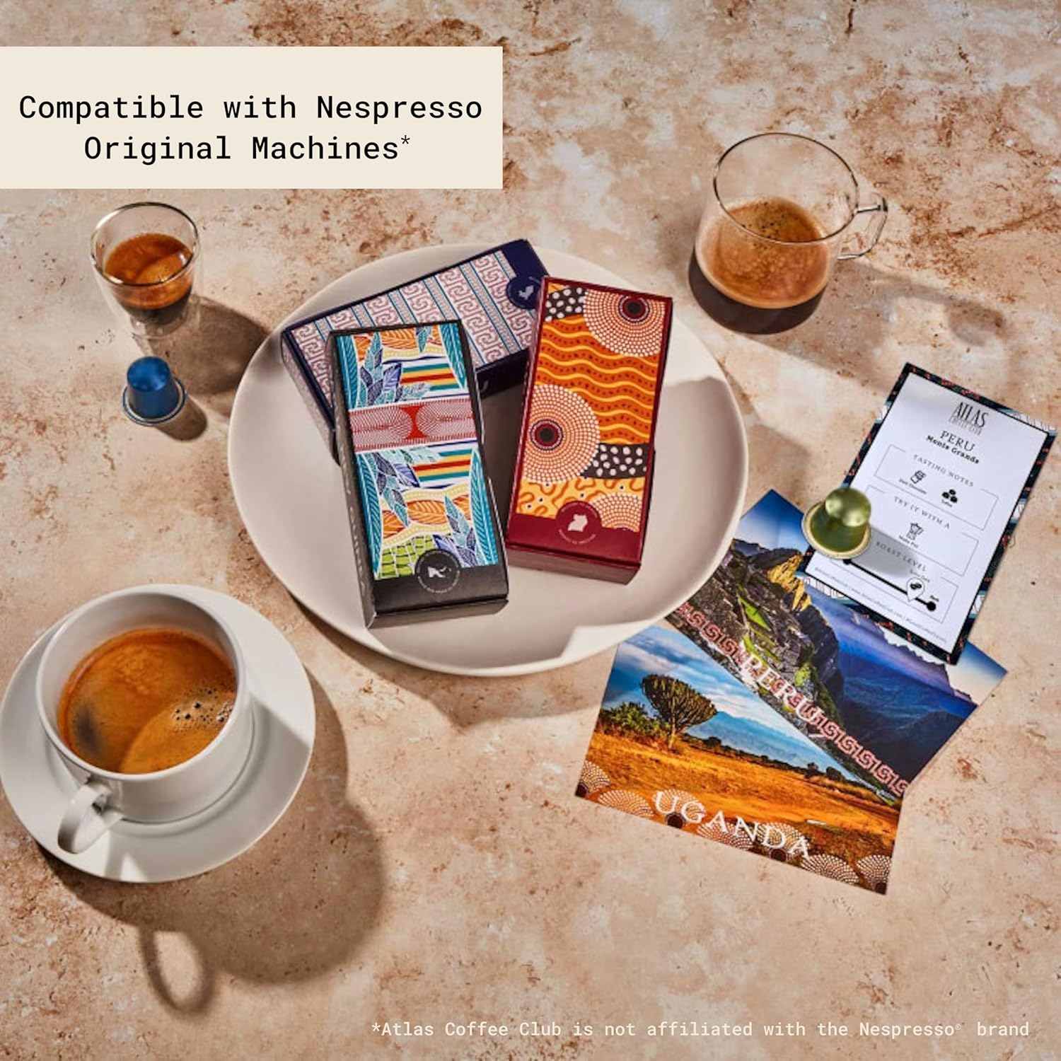 - ENJOY: 80 Atlas Coffee Club espresso capsules (8 boxes). Compatible with: Nespresso Original Machines*, Essenza Mini, Essenza Plus, Pixie, CitiZ, Lattissima, KitchenAid, and Creatista Nespresso Original machines.* Not compatible with Nespresso Vertuo machines. *Atlas Coffee Club is not affiliated with the Nespresso brand.