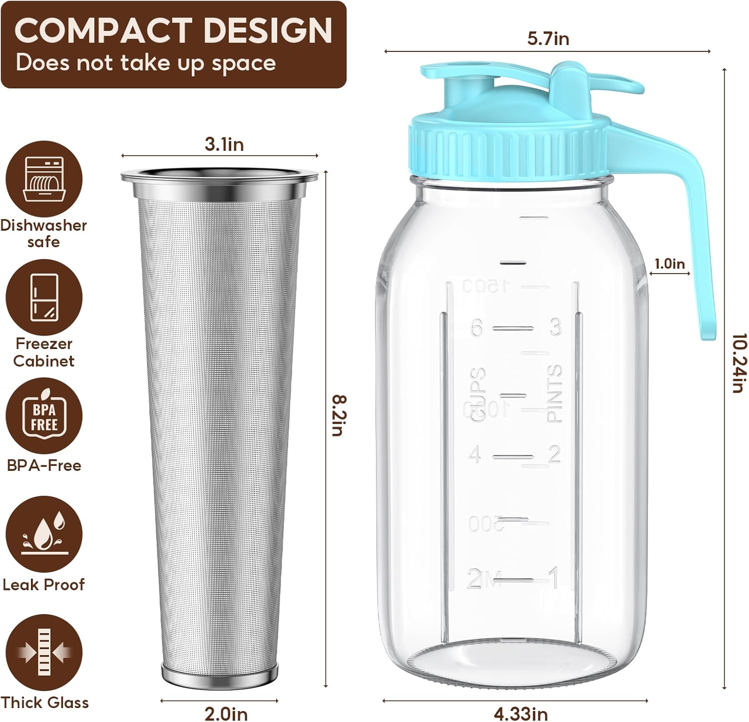 Cold Brew Coffee Maker Jar - 2 Pack 64 oz(2 Quart / 1.9 Liter)Glass Cold Brew Maker with Handle, Stainless Steel Filter&Leak-Proof Lid, Heavy Duty Cold Brew Pitcher for Iced Coffee, Sun Tea, and Milk