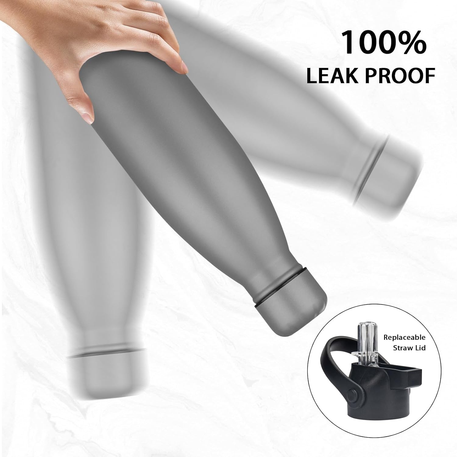 Insulated Water Bottle,17oz Stainless Steel Water Bottles with straw lid,Metal Sports Thermos Water Bottles for Boys,Girls,Double Wall Vacuum BPA-Free Flask for School, Sports (Grey)