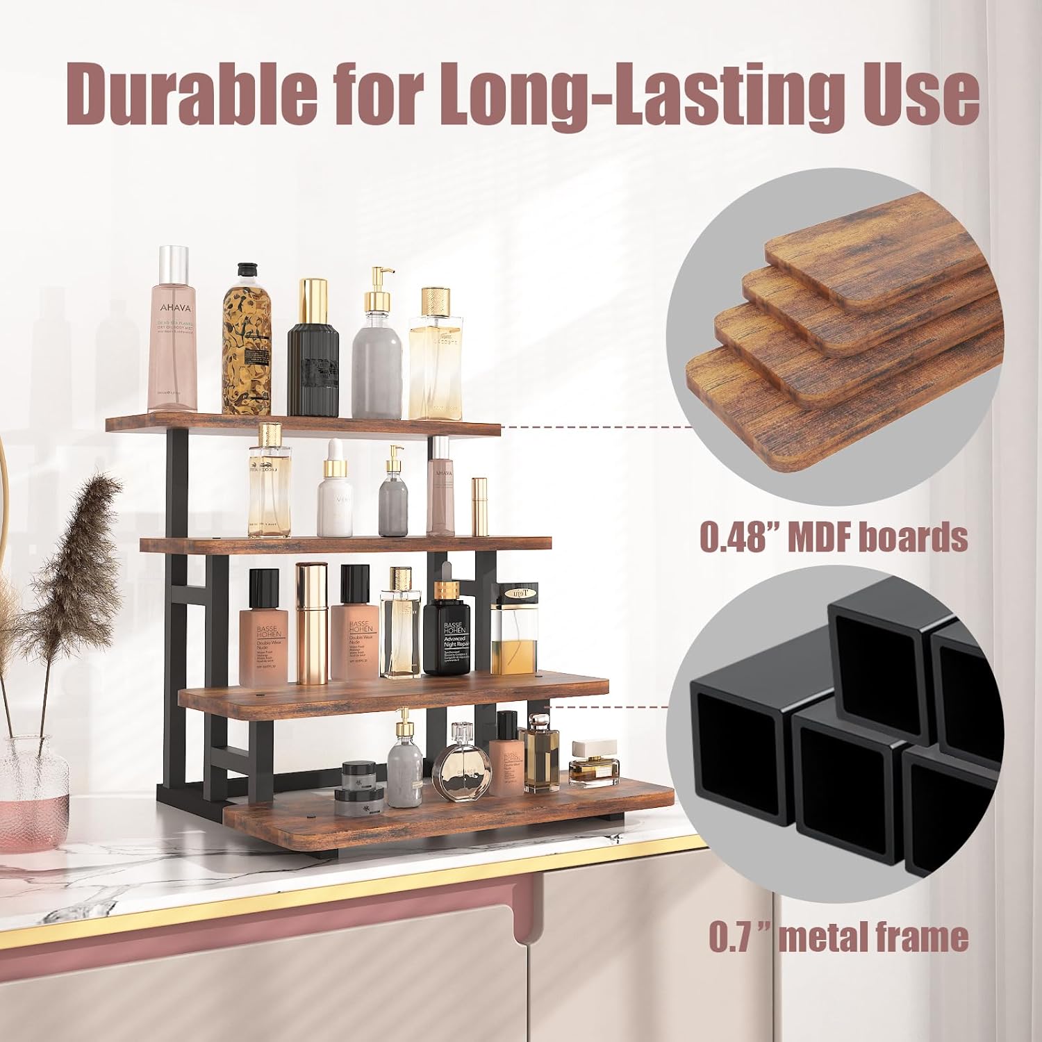 - Sturdy and Reliable Construction: This tiered tray stand, crafted with a reinforced 0.7" metal frame and thick 0.48” MDF boards, offers exceptional durability and stability. The non-slip bottom pads prevent wobbling, ensuring your display stand stays securely anchored during use. Its robust build makes it ideal as a perfume organizer and even an action figure stand.