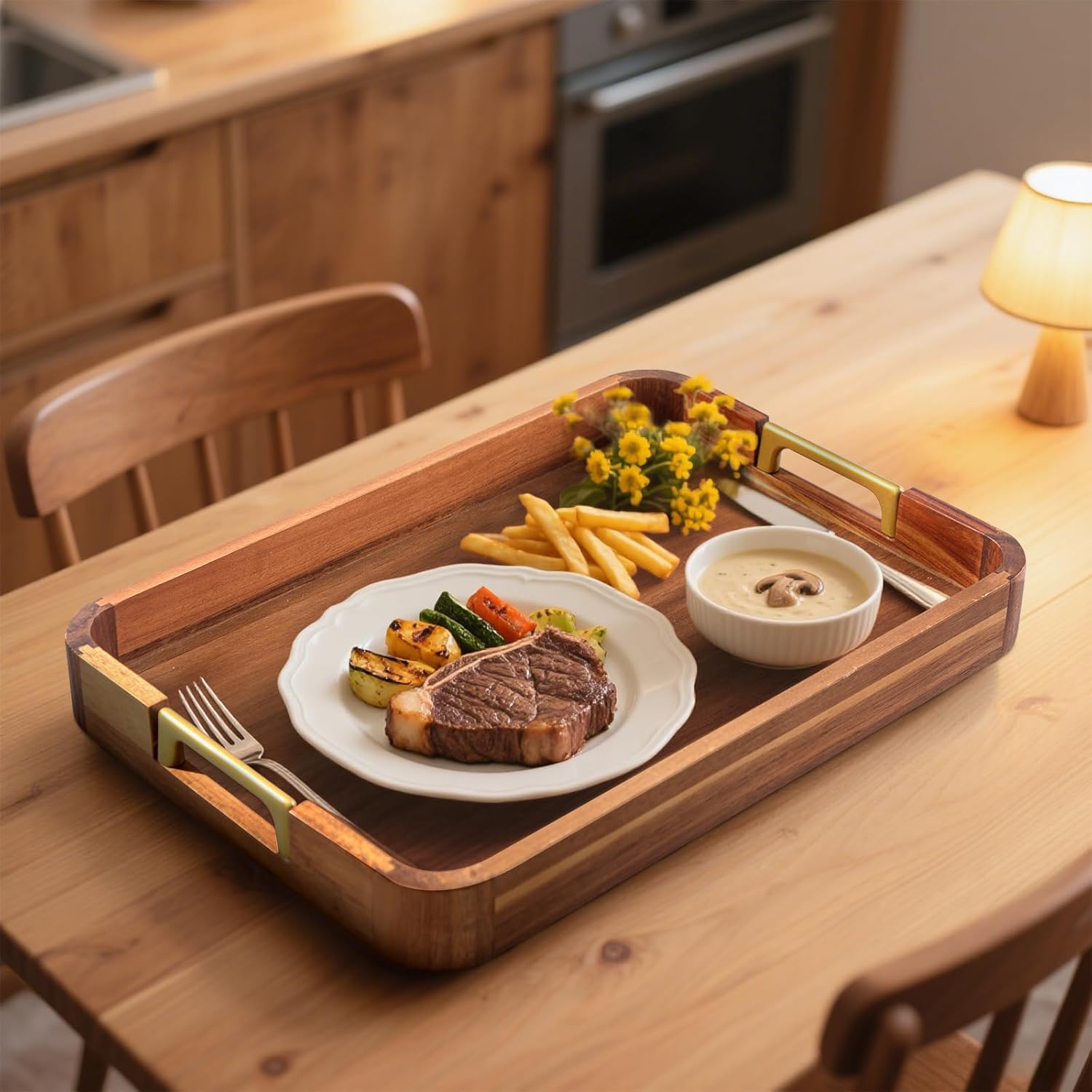 Acacia Wood Serving Tray with Metal Handles, 17x12in Food Drinks Tray for Coffee Table, Breakfast, Dinner & Bar, Rustic Decorative Storage Tray for Ottoman, Kitchen, Parties