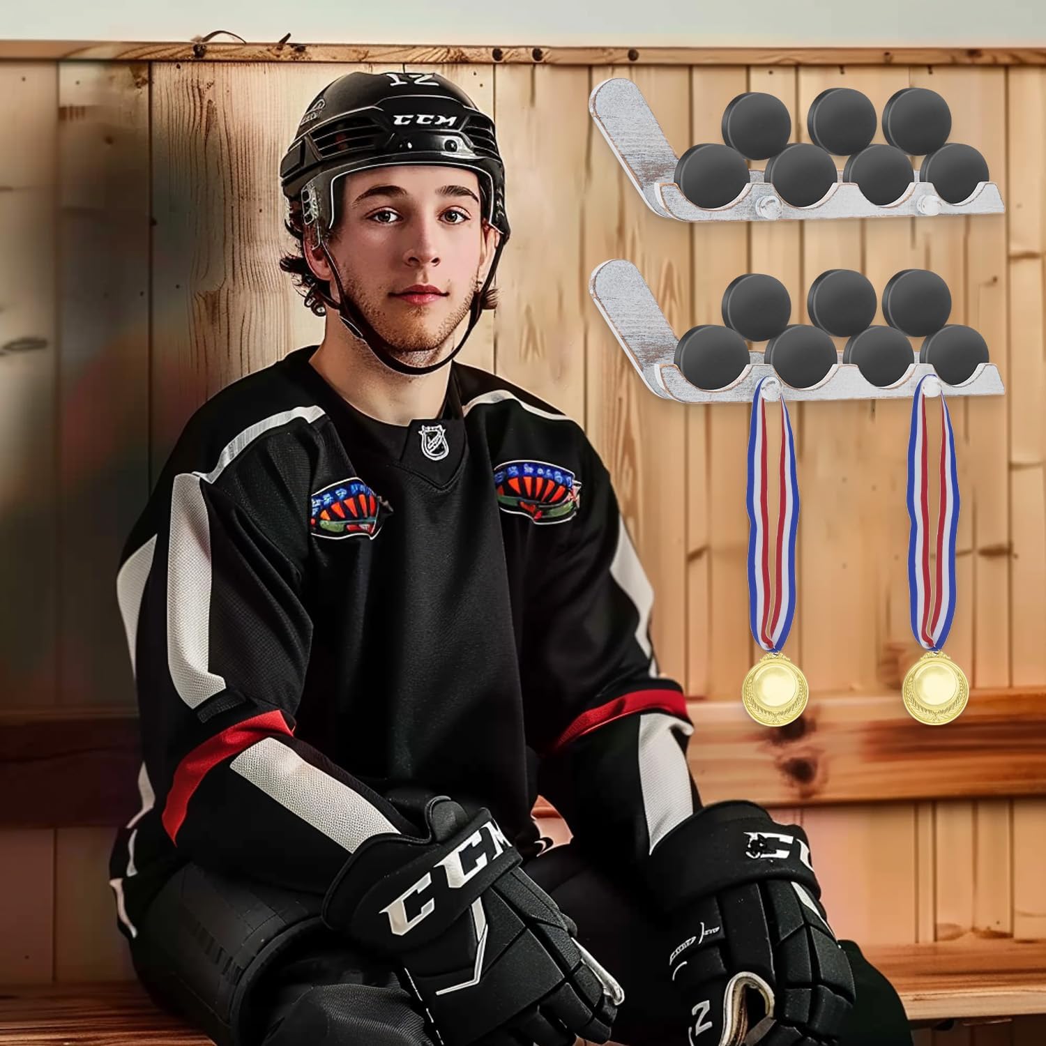 - Unique appearance: This product is different from other ice hockey display stands on the market, Hockey Puck conceals the mounting opening, achieving a seamless look post installation. The hockey puck stick-shaped display stands make it look like a hockey game is in progress, and have two cover caps hang medals, giving it an immersive feel