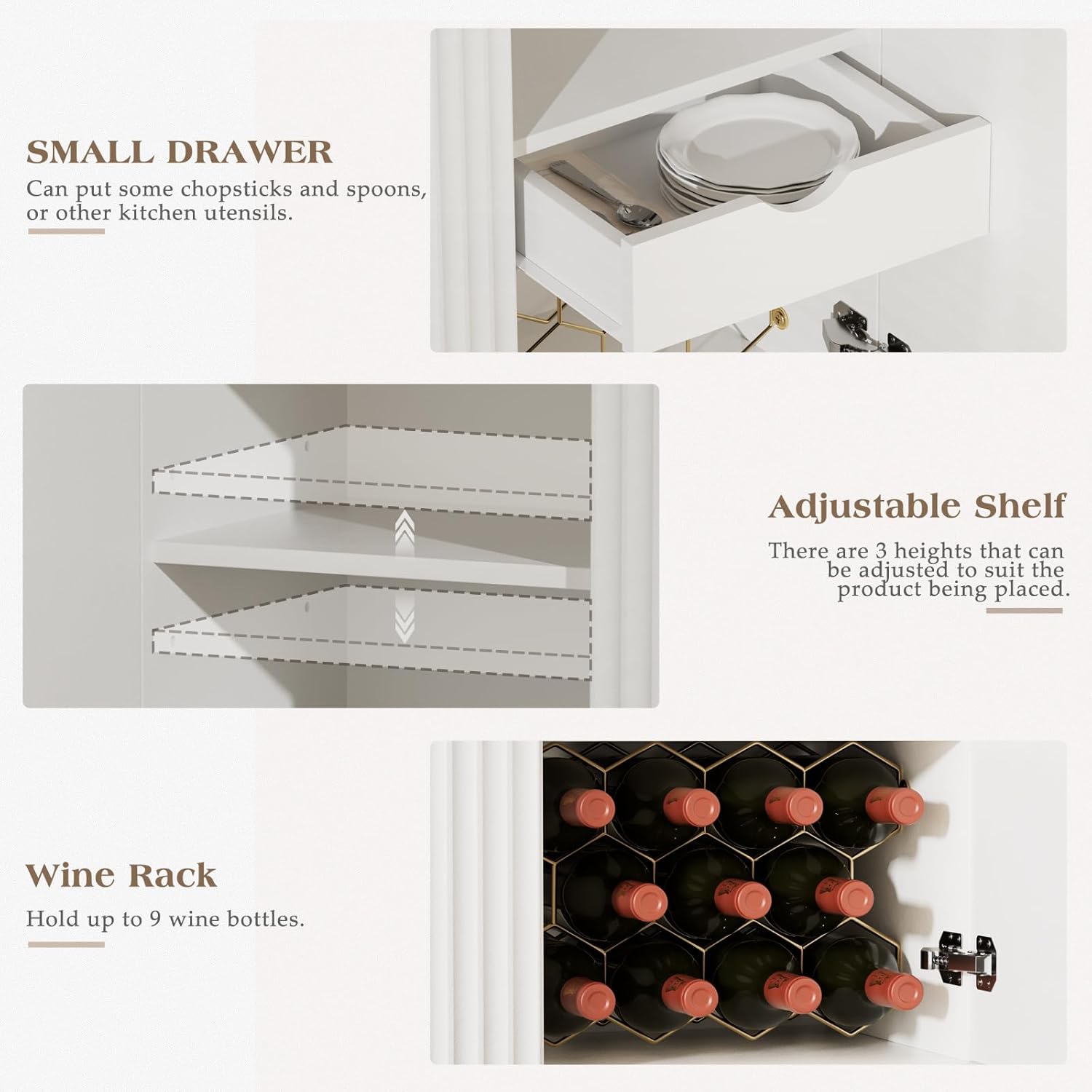 - Multifunctional Wine Bar Cabinet: This is a multi-functional wine cabinet, not only can be used as a coffee bar cabinet, but also can be used as a buffet sideboard, or kitchen storage cabinet, spacious storage space to meet your various needs
