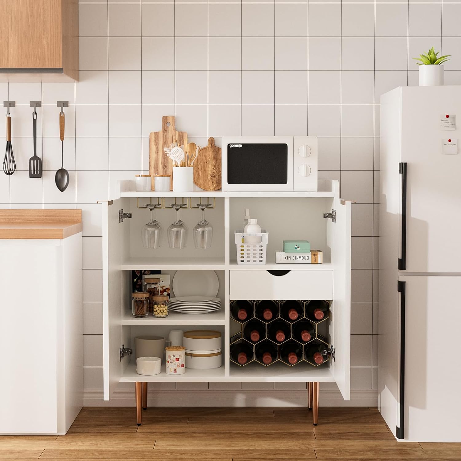 - Fashionable and Beautiful: EOYUTLLY white liquor cabinet with 2 fluted textured doors, rose gold metal handles and legs, Whether it's in your living room, dining room or kitchen, it blends in perfectly with the rest of your decor, providing storage space and a sleek, beautiful look for your room