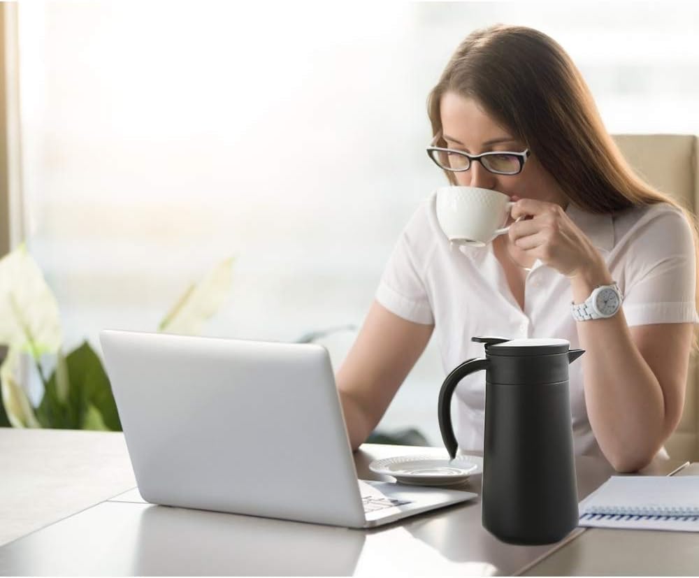 - SINGLE HAND POURING, USER FRIENDLY: Pour spout opens easily when press the push button, making one-handed pouring of this thermal pot simple. It's safe to touch the coffee flask exterior body either it is a hot or cold beverage inside as the temperature is locked in and the carafe body stays cool