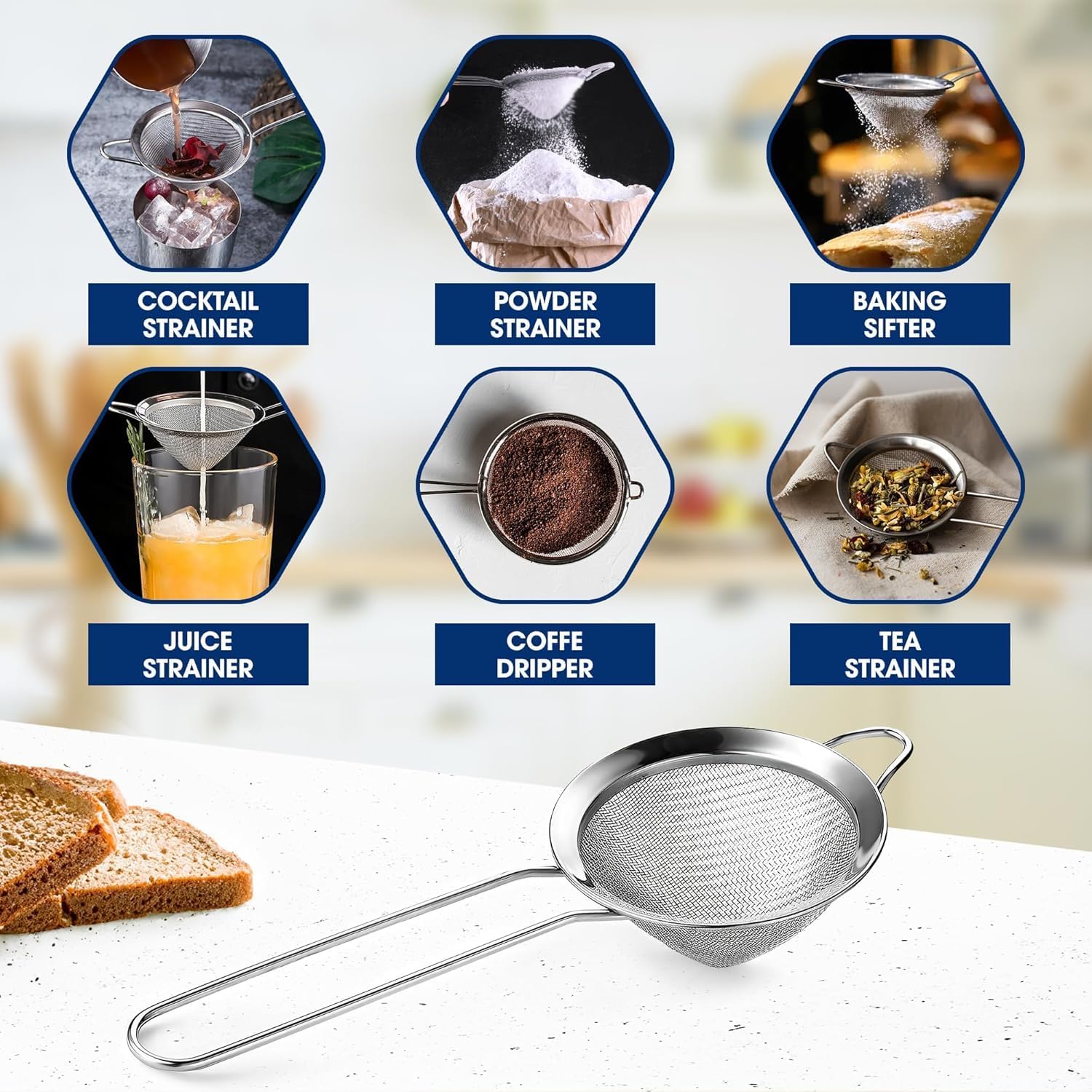 - Convenient to Use: The long handle of the fine mesh strainers make it easy to use, and the hanging loops allow for convenient storage. It can also be used as cocktail strainer and small flour sifter.