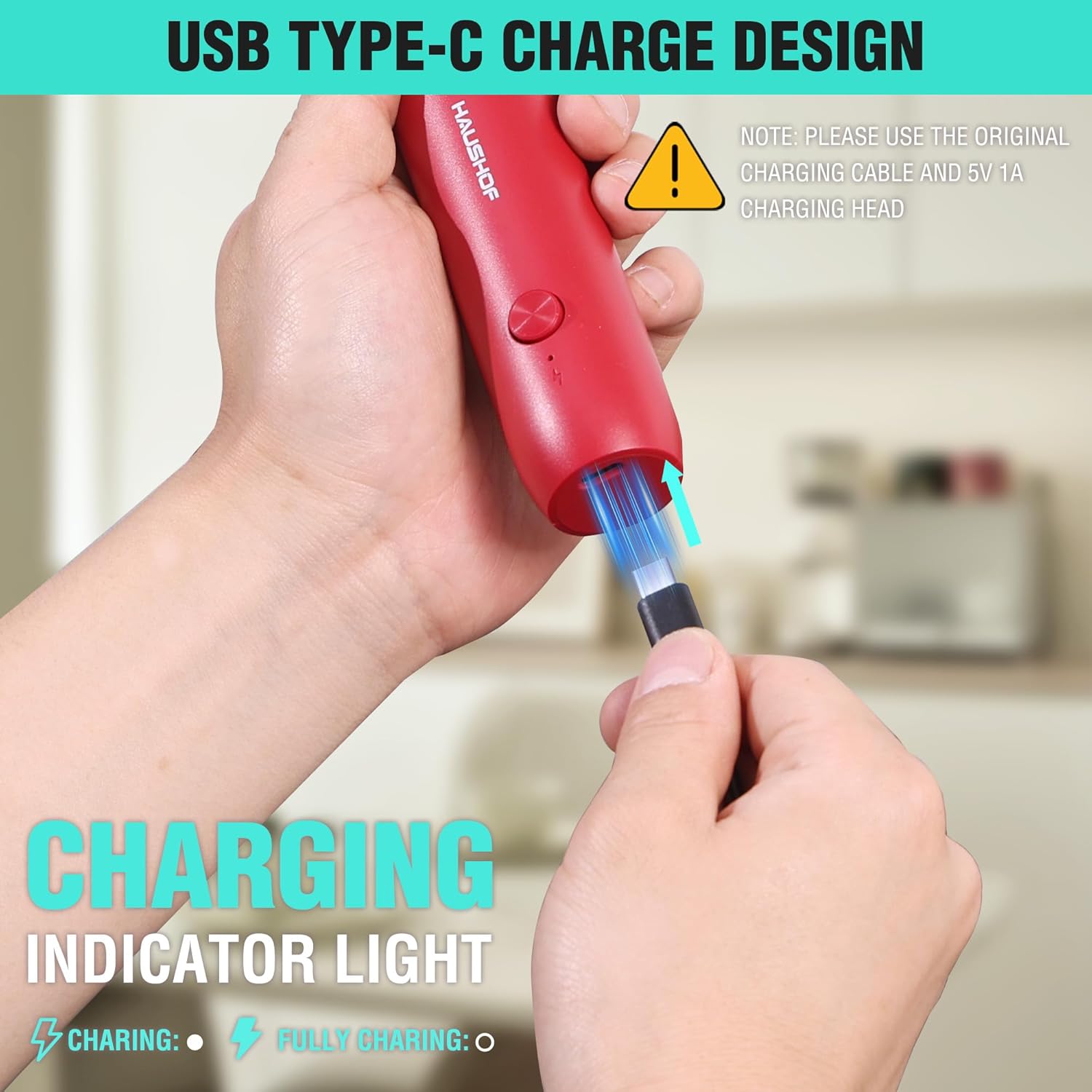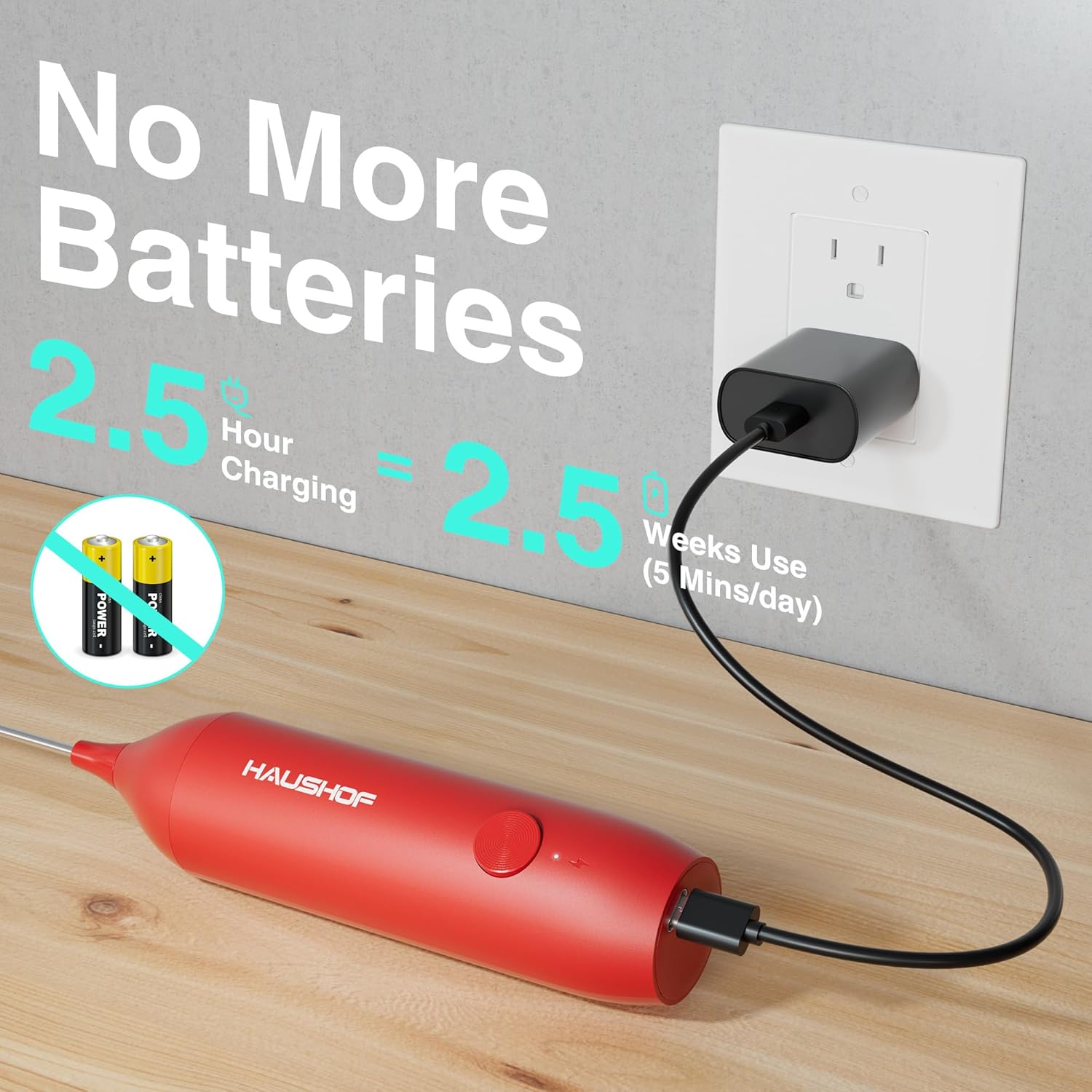 HAUSHOF Powerful Rechargeable Milk Frother Wand with Stand, Handheld Electric Foam Maker, Drink Mixer with Detachable Stainless Steel Whisk for Coffee Latte, Cappuccino, Matcha, Red