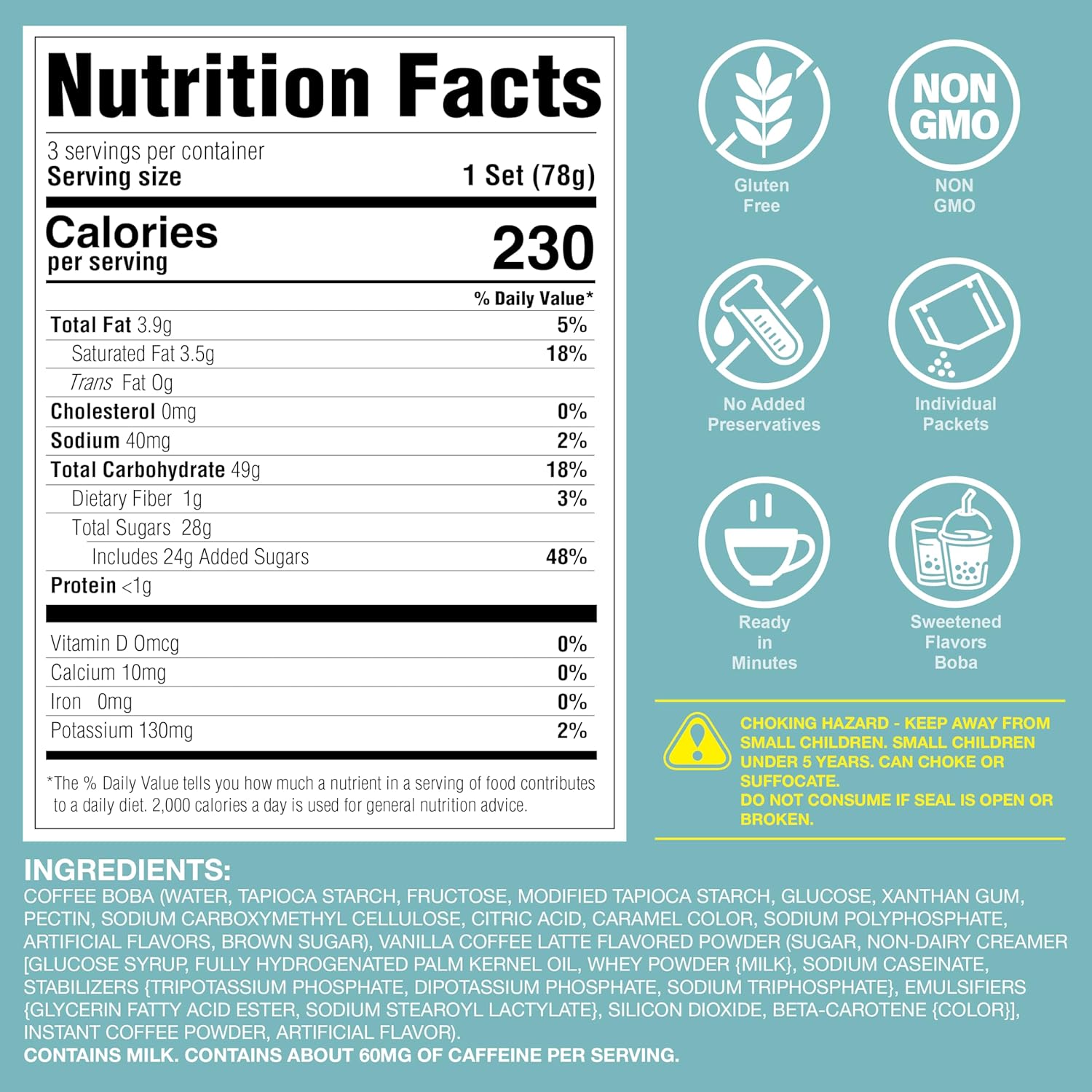 - WHAT IS INSIDE - 3 Individually wrapped portions of Brown Sugar boba, 3 vanilla latte coffee packets, & 3 extra wide paper straws. Store in a cool, dry place (no refrigeration necessary).