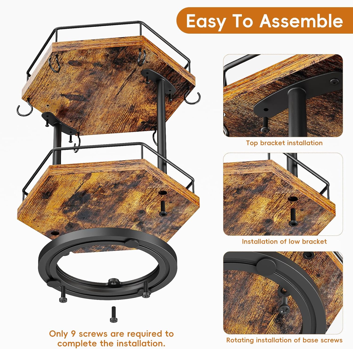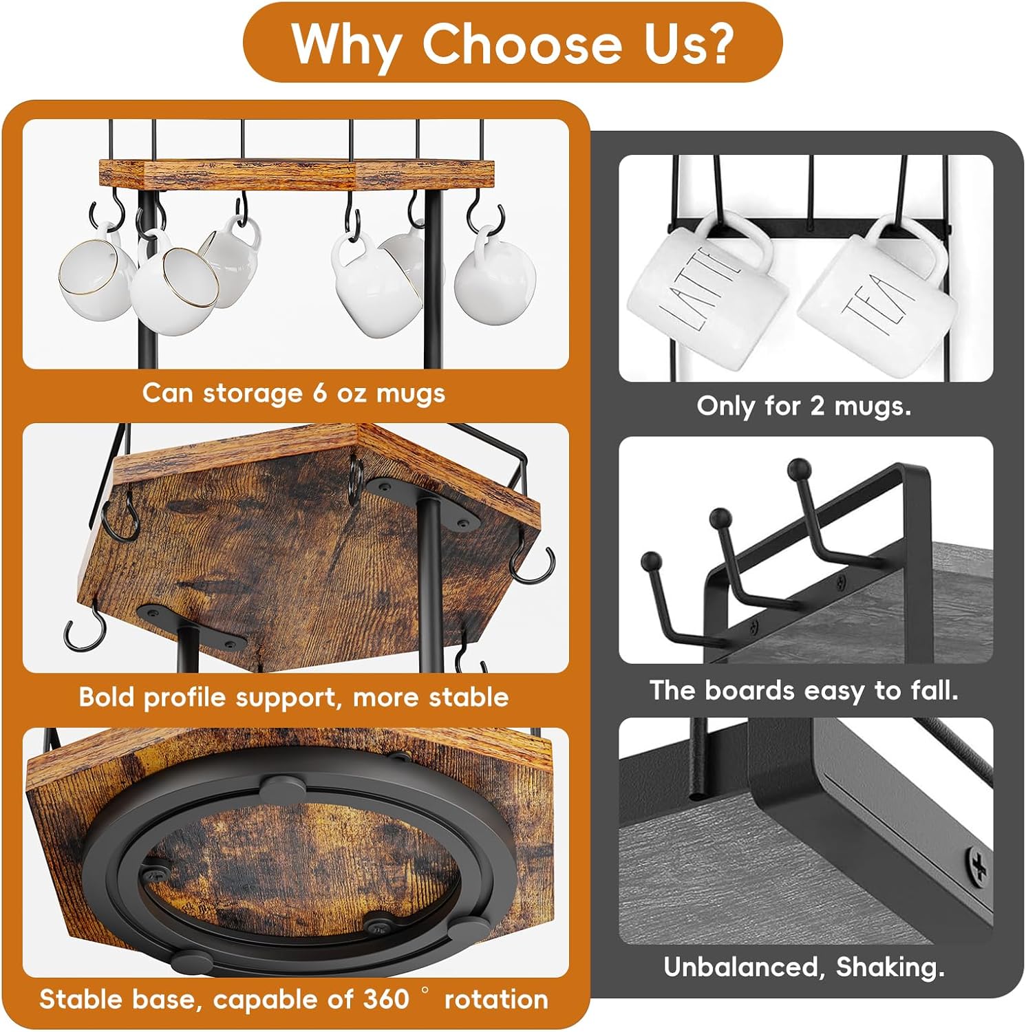 KLM 2 Tier Coffee Bar Organizer Countertop Station Shelf for Home Office, Multi-Functional Coffee Mug Cup Holder Stand, Accessory Storage Rack with 6 Hooks, 360° Rotated Coffee Cup Holder for Counter