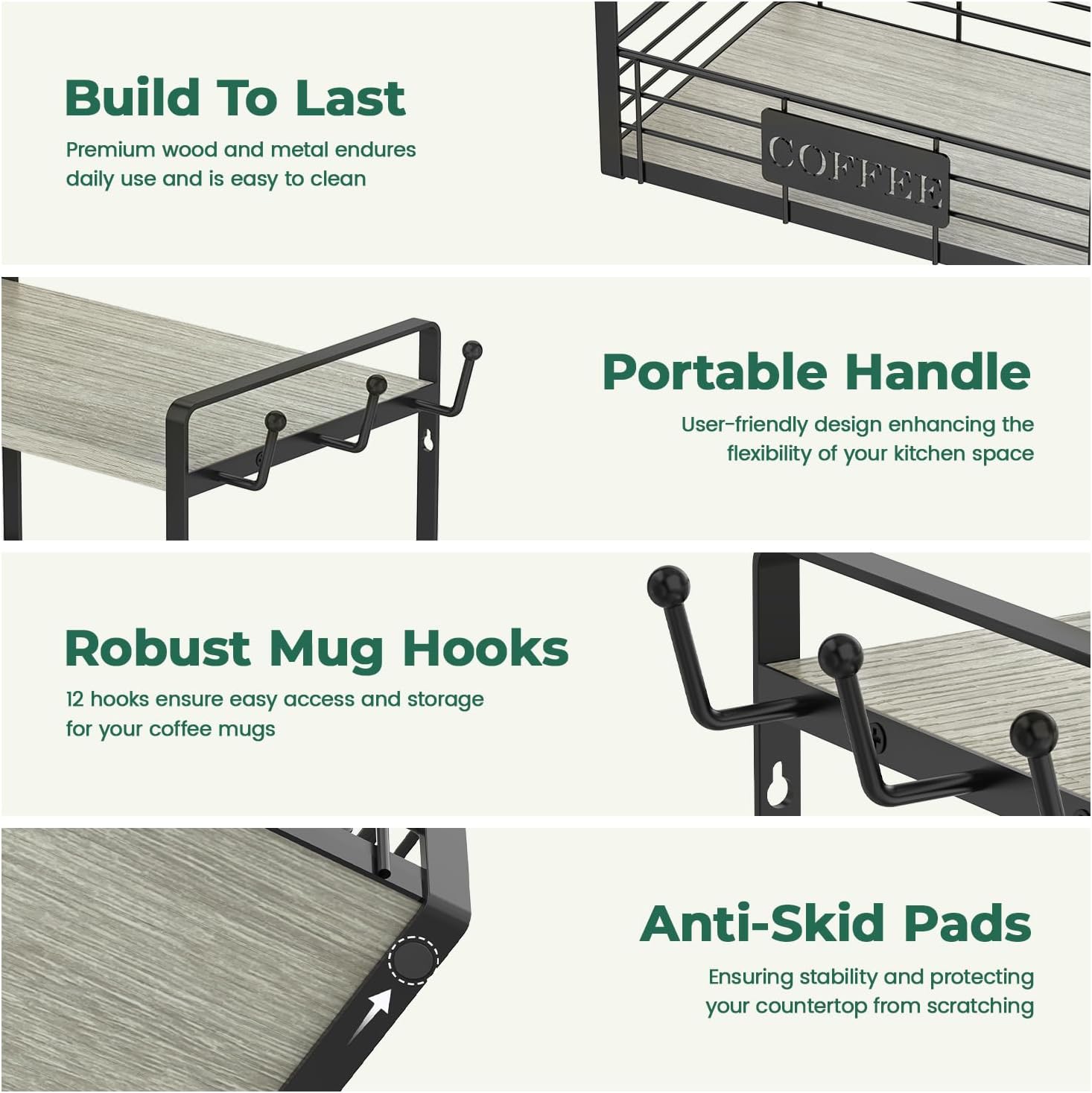- Spacious Dual-Tier Storage: Transform your home coffee station with EsLuker.ly’s coffee cup holder for countertop, featuring two-tier shelves and 12 mug hooks. This design provides ample space for all your coffee essentials, meeting the storage needs of any family kitchen or office coffee station