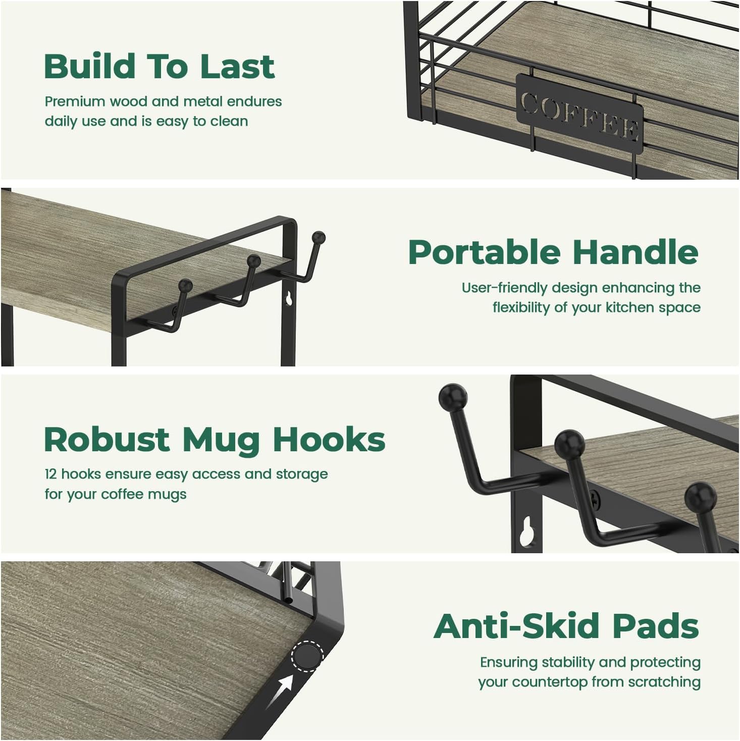 - Spacious Dual-Tier Storage: Transform your home coffee station with EsLuker.ly’s coffee cup holder for countertop, featuring two-tier shelves and 12 mug hooks. This design provides ample space for all your coffee essentials, meeting the storage needs of any family kitchen or office coffee station