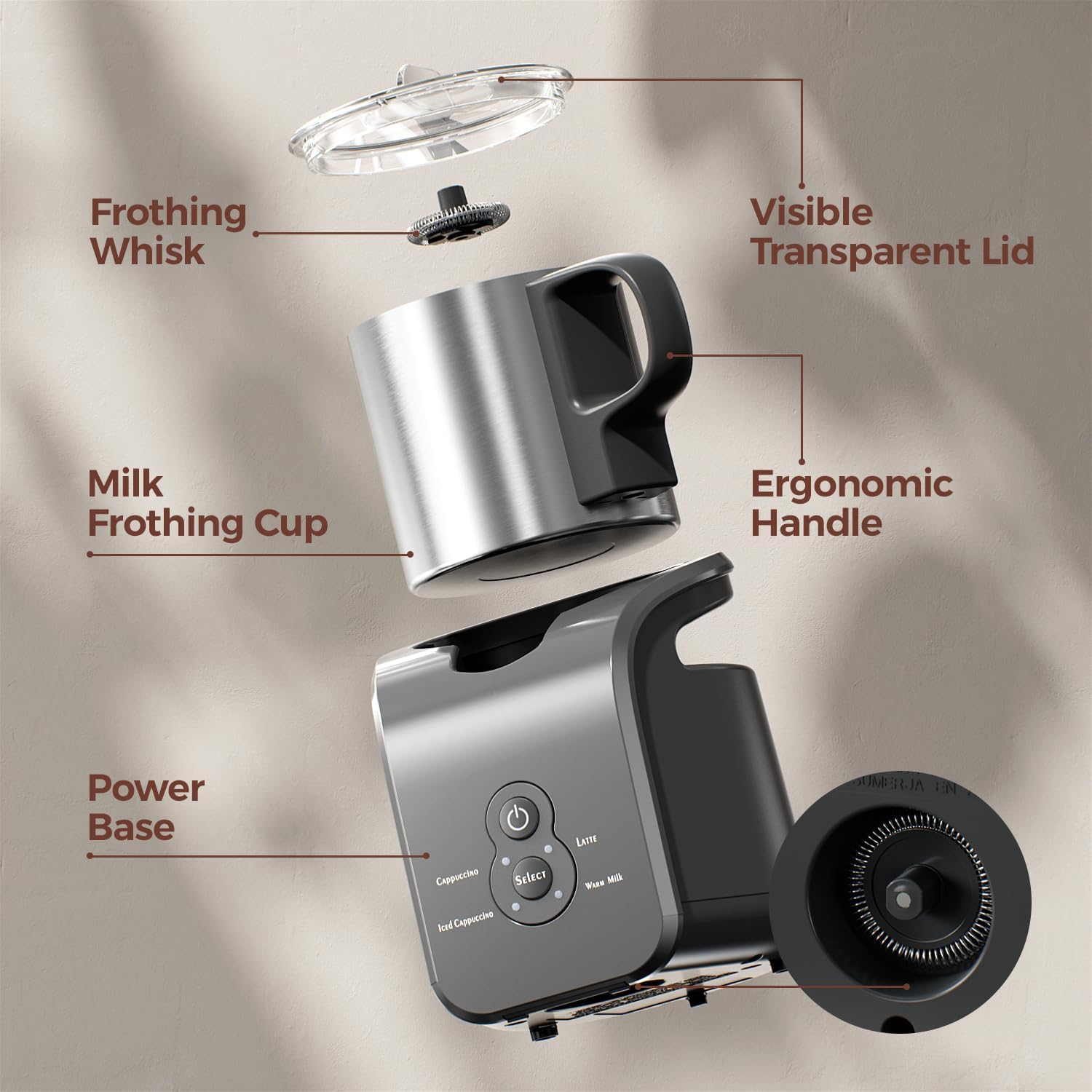 - Scientific Design: The Cold Froth Milk Frother has a removable stainless steel milk jug, a high quality clear lid and an ergonomically designed handle with a stirring attachment for frothing and stirring for a variety of beverage making needs.