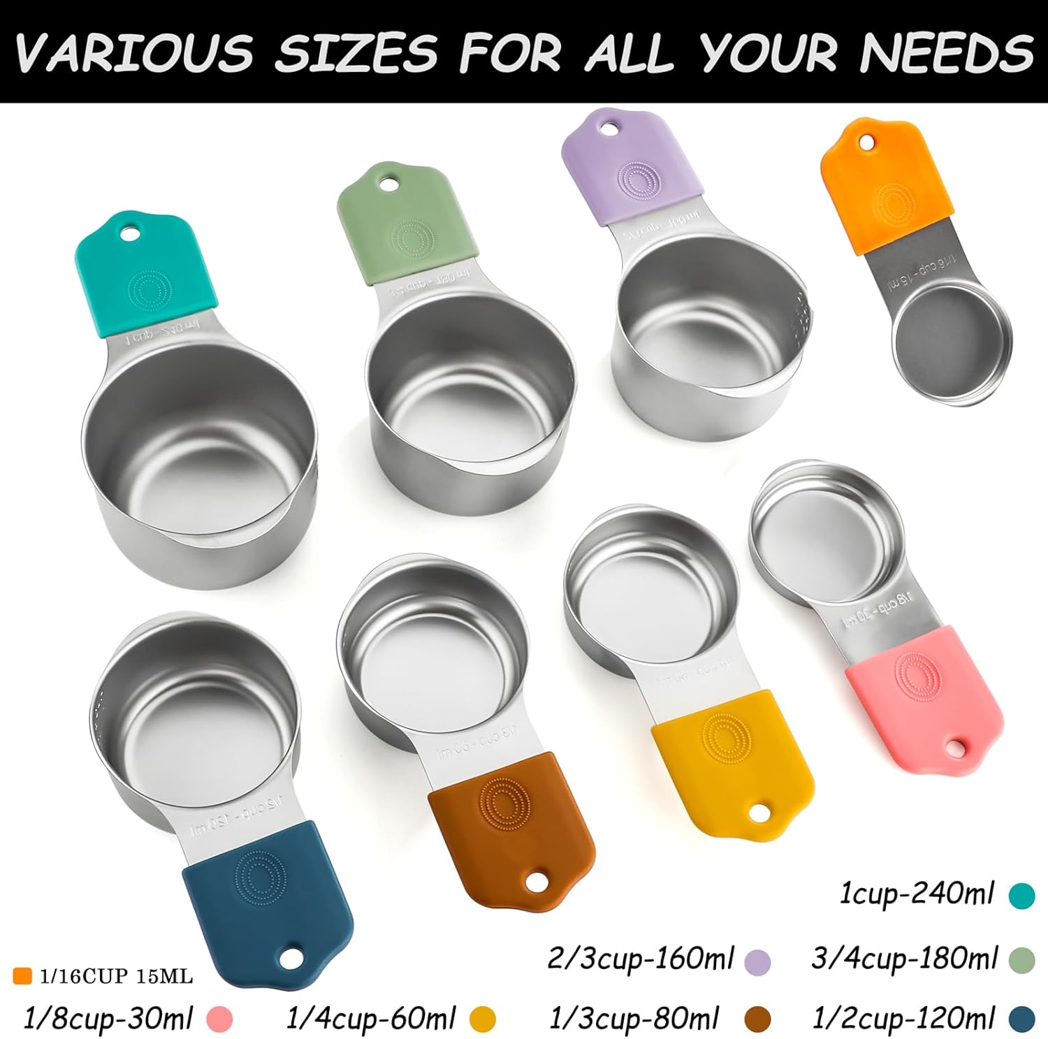- 【Magnetic Measuring Cups and Spoons Set】This stainless steel heavy duty magnetic measuring cups and spoons set includes 8 magnetic measuring Cups set (1/16 cup,1/8 cup, 1/4 cup, 1/3 cup, 1/2 cup, 2/3 cup, 3/4 cup, 1 cup), 8 magnetic measuring Spoons set (1/16 tsp,1/8 tsp, 1/4 tsp, 1/2 tsp, 3/4 tsp, 1 tsp, 2 tsp, 1 tbsp), 1 Leveler, various sizes meet all your baking needs.