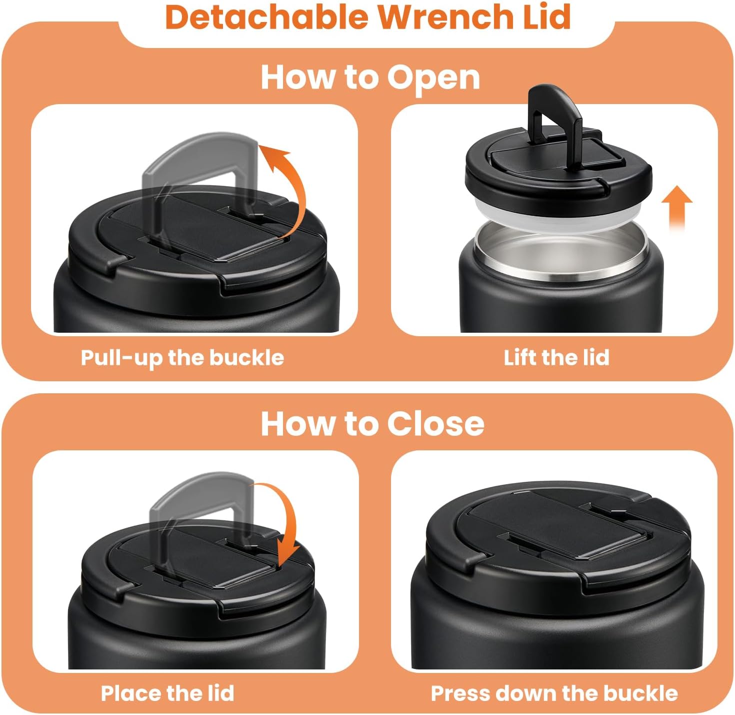 - New Buckle of Lid: The food containers feature a press-seal construction, allowing you to simply pull the handle upwards to 90° to open the lid/ 90° downward closure. This design is maintaining vacuum no need to rotate the lid open . Additionally, the container comes equipped with a carrying handle, making it convenient for your child to carry it. Whether at school, an outdoor outing, or a family gathering, this user-friendly design empowers children to confidently enjoy their delicious meals.