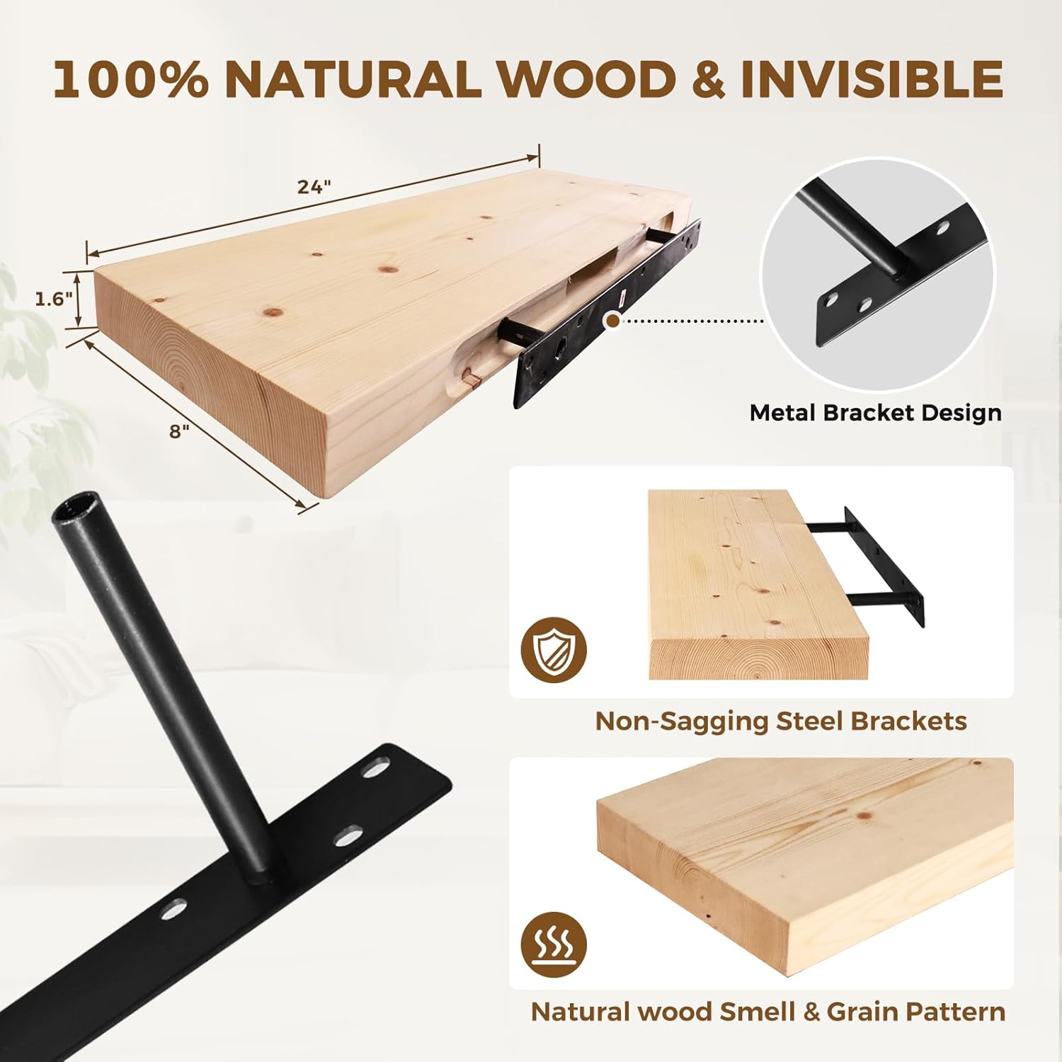 24x8x1.6 inch Floating Shelves Set of 2 – Solid Wood Rustic Wood Wall Mounted Shelf for Kitchen, Bathroom, Living Room