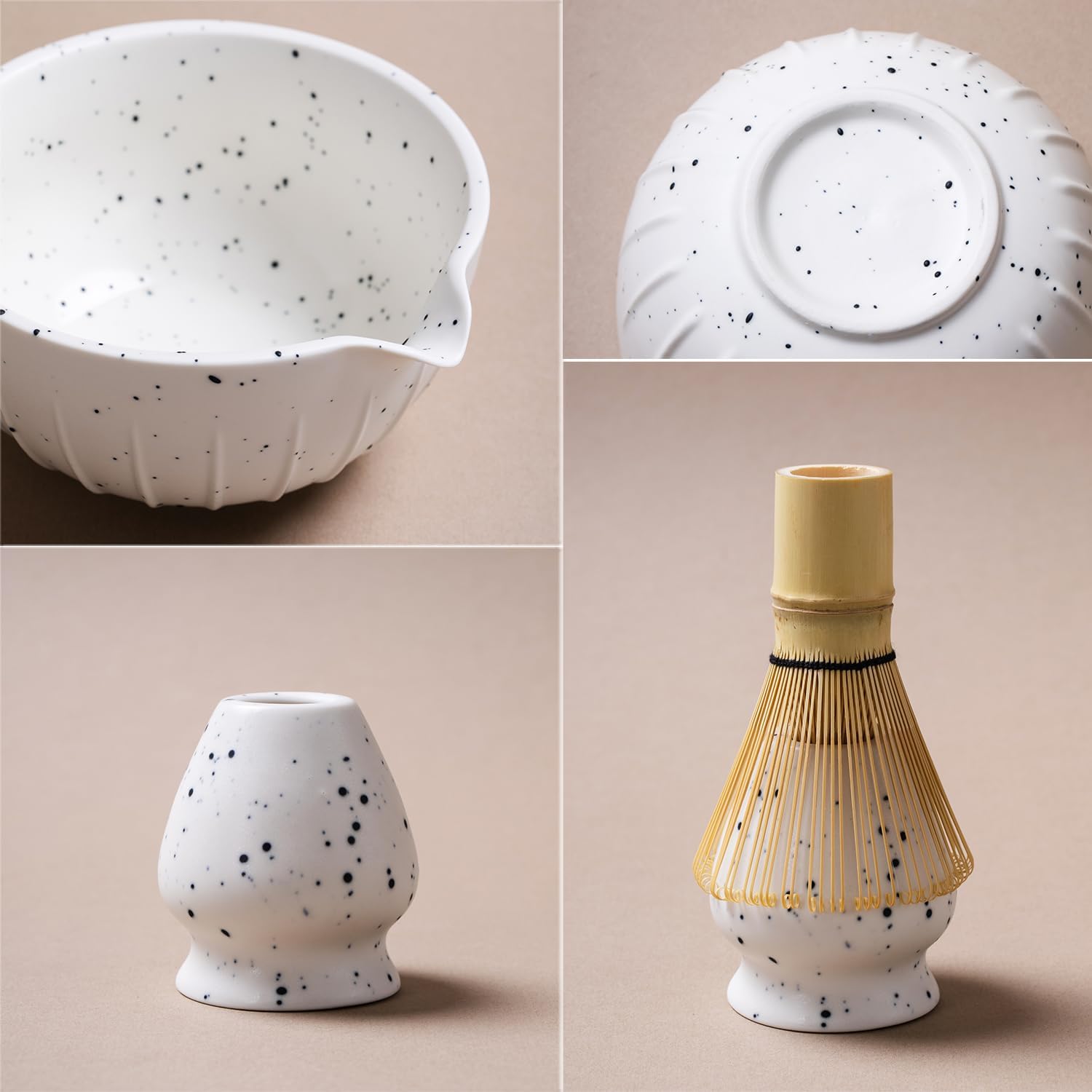- Tea Bowl with Pouring Spout: The lead-free ceramic matcha bowl ( 520ml/18.3oz) is designed with a pouring spout that prevents tea spilling and lets you better share matcha with your family and friends. (We also equip you with a 9.05" x 12.9" waterproof tea mat so you can keep your table clean while making matcha drink)