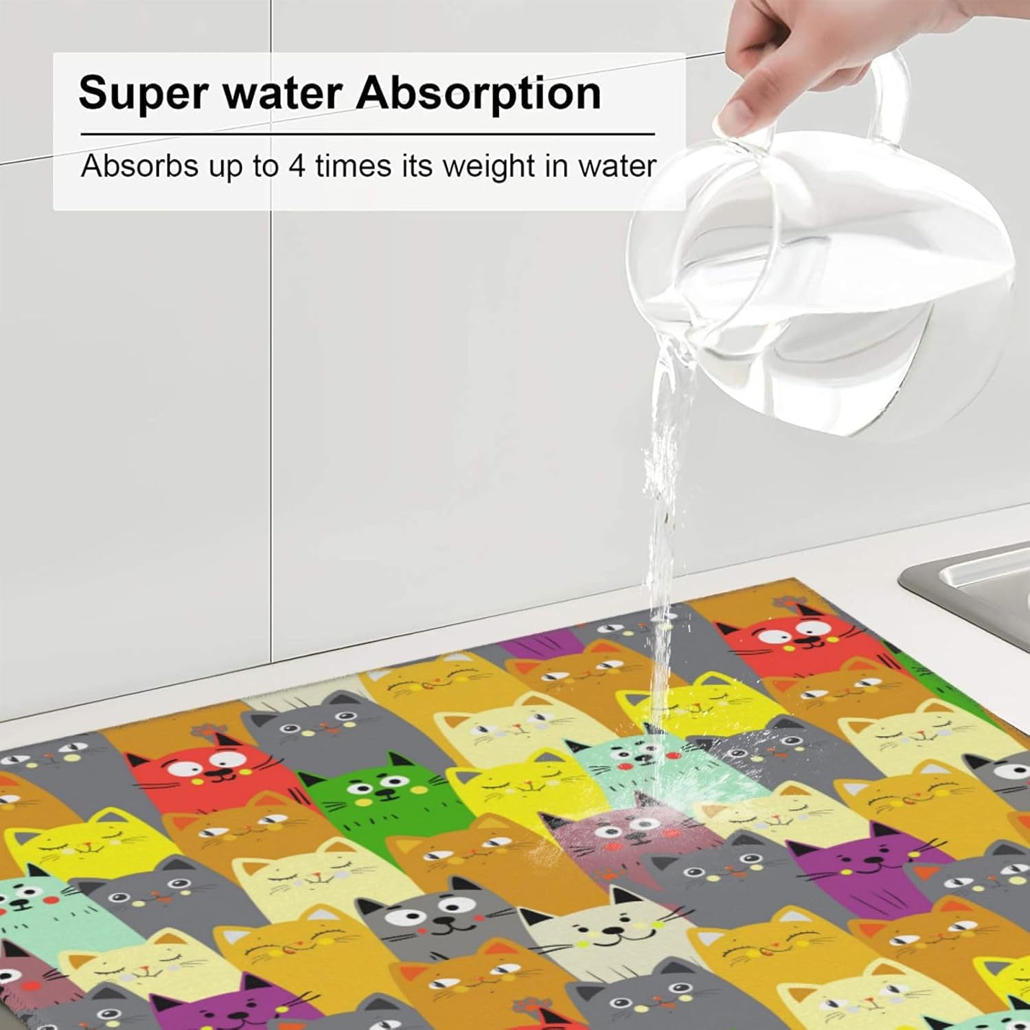 Charming Cat Dish Drying Mat, Highly Absorbent Microfiber Kitchen Counter Pad Reusable Washable, 16*18"