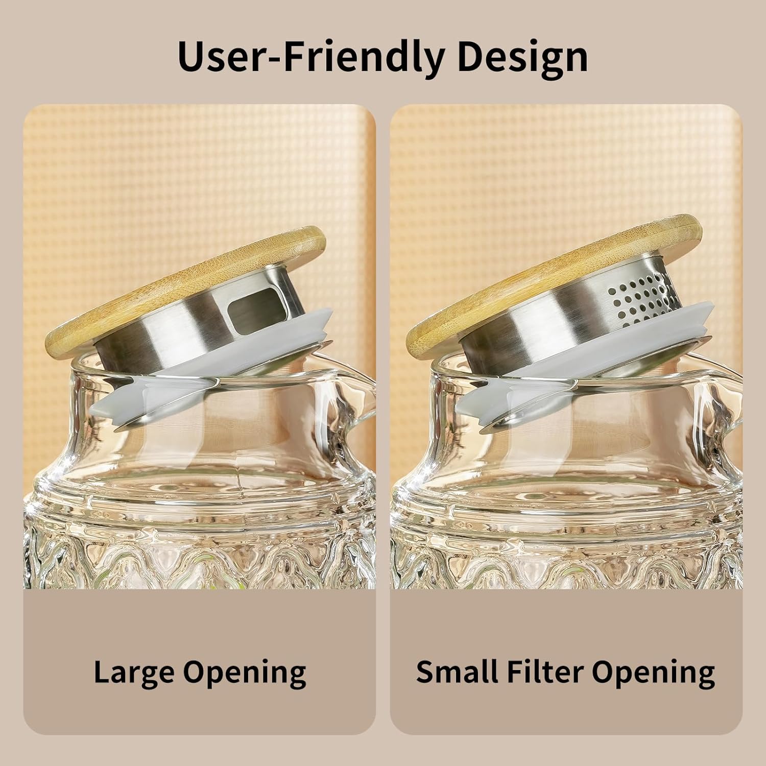 - 【VINTAGE AND DISTINCTIVE DESIGN】Buaic water pitcher is made of heat-resistant borosilicate glass, which can withstand temperatures from -20°C ~150°C/-4°F~302°F. Its lead-free and BPA-free construction makes it a healthier choice in your daily life for iced tea, margaritas, juice, coffee, sangrias, wine, etc. Vintage and distinctive design works with traditional or casual place settings. It‘s not only a pitcher, but also a beautiful decoration on the table