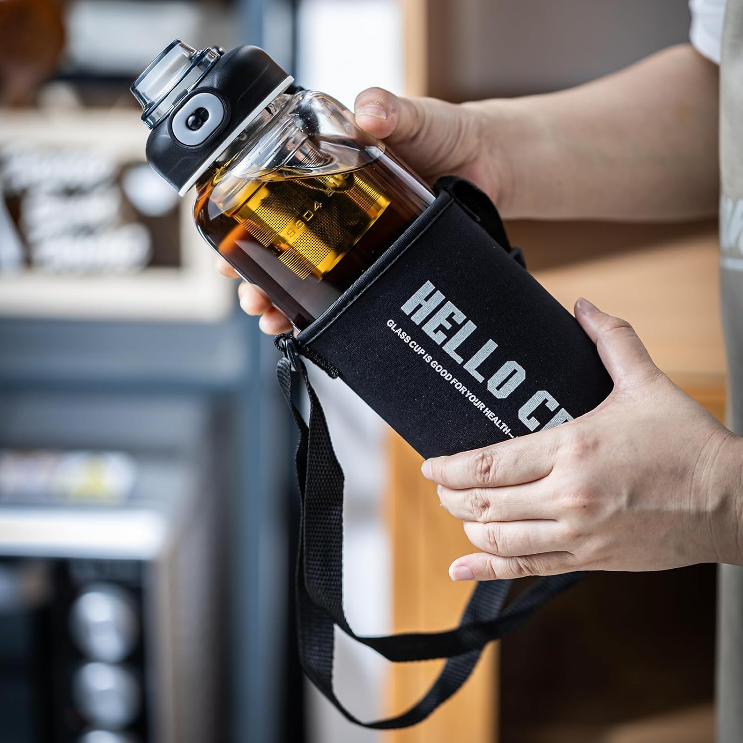 34oz tea bottle with infuser - Large Capacity Glass Water Bottle, With Time Mark, Stainless Steel Tea Strainer,Sleeve, BPA Free,For hot or cold drinks, coffee, tea and water