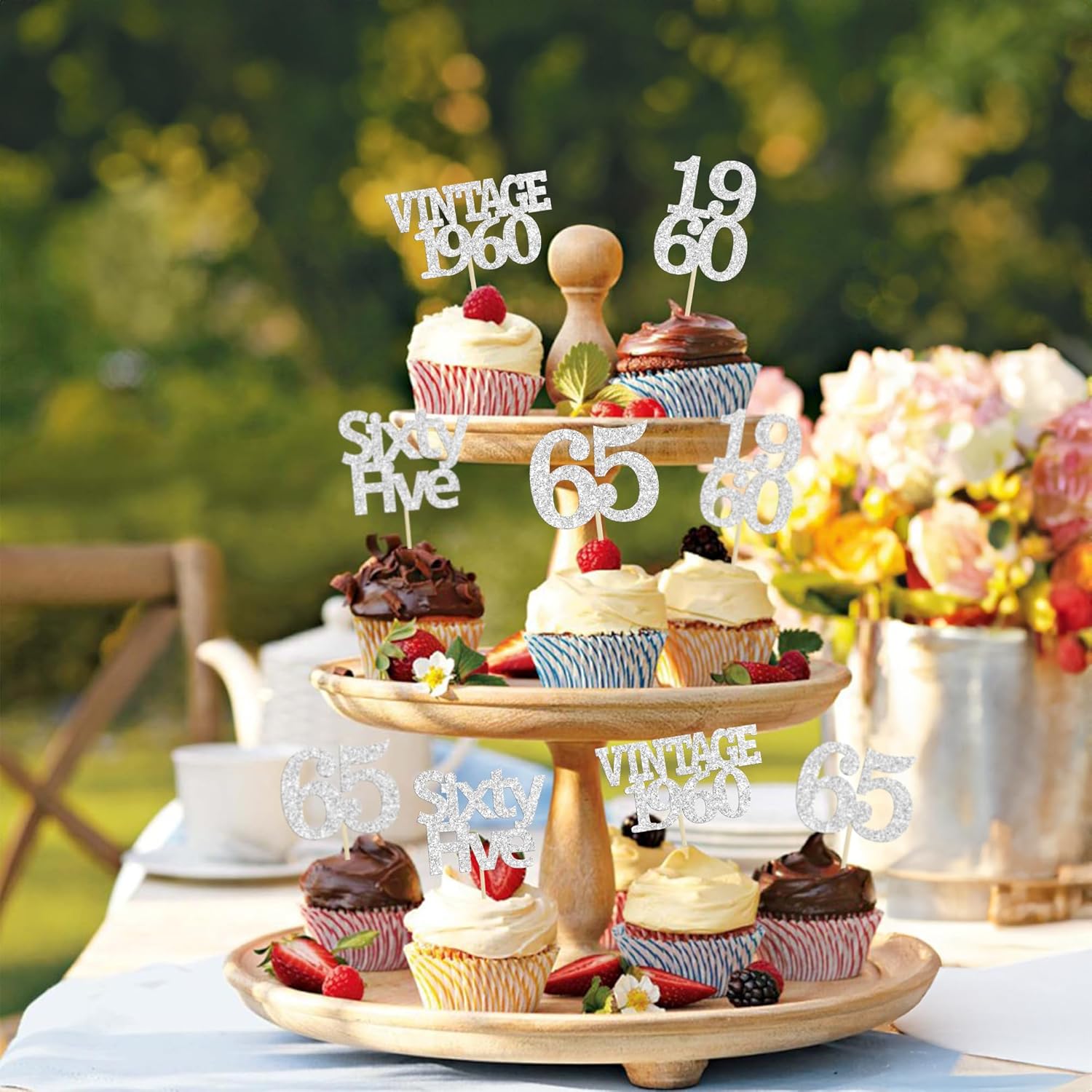 Gyufise 24Pcs 65th Birthday Cupcake Toppers Glitter Cheers to 65 Fabulous Sixty Five Vintage 1960 Cupcake Picks 65th Birthday Wedding Anniversary Party Cake Decorations Supplies Silver