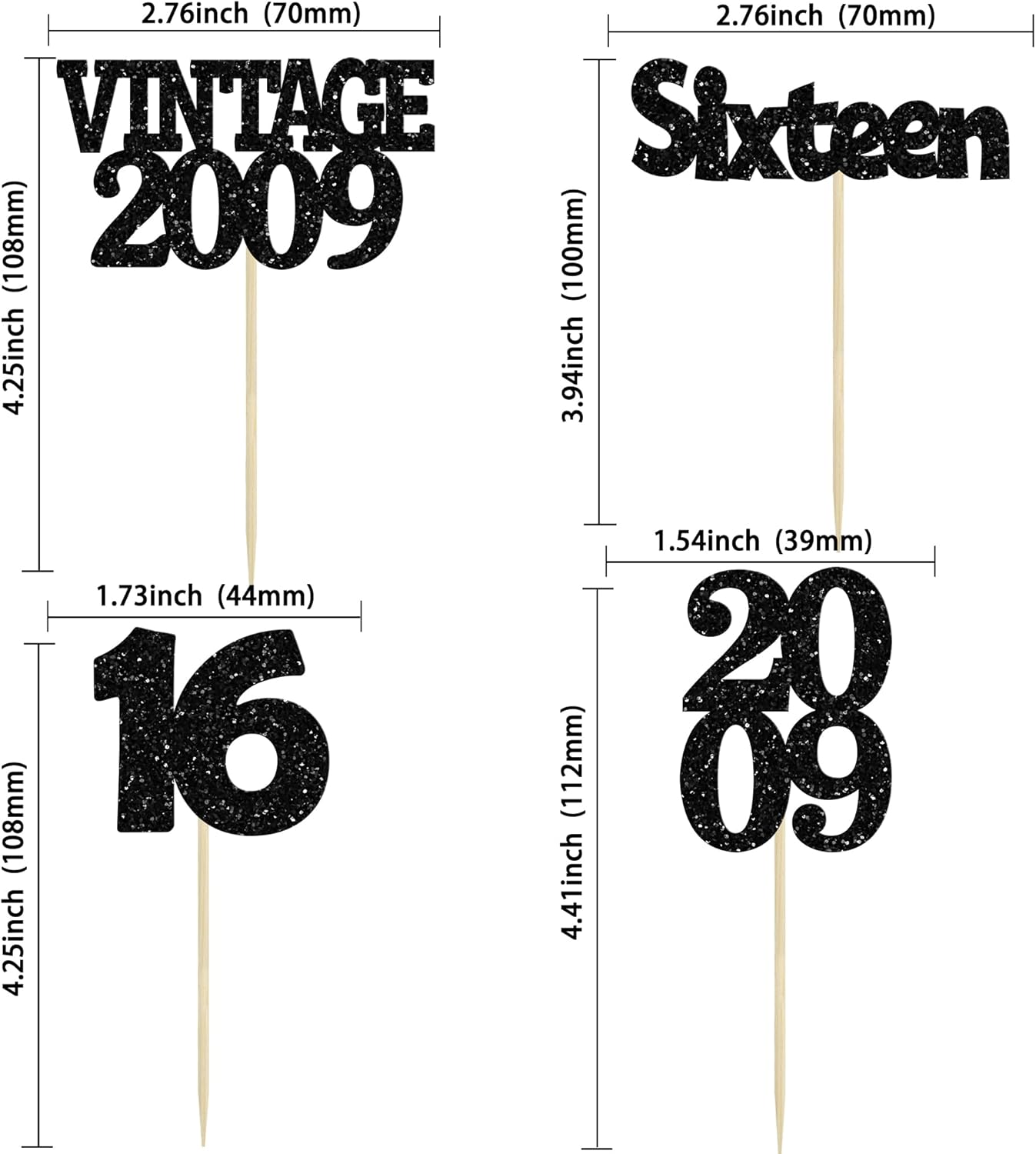 Gyufise 24Pcs 16th Birthday Cupcake Toppers Glitter Sixteen Vintage 2009 Sweet 16 Cupcake Picks Hello 16 Years Birthday Cake Decorations for Happy 16th Birthday Anniversary Party Supplies Black