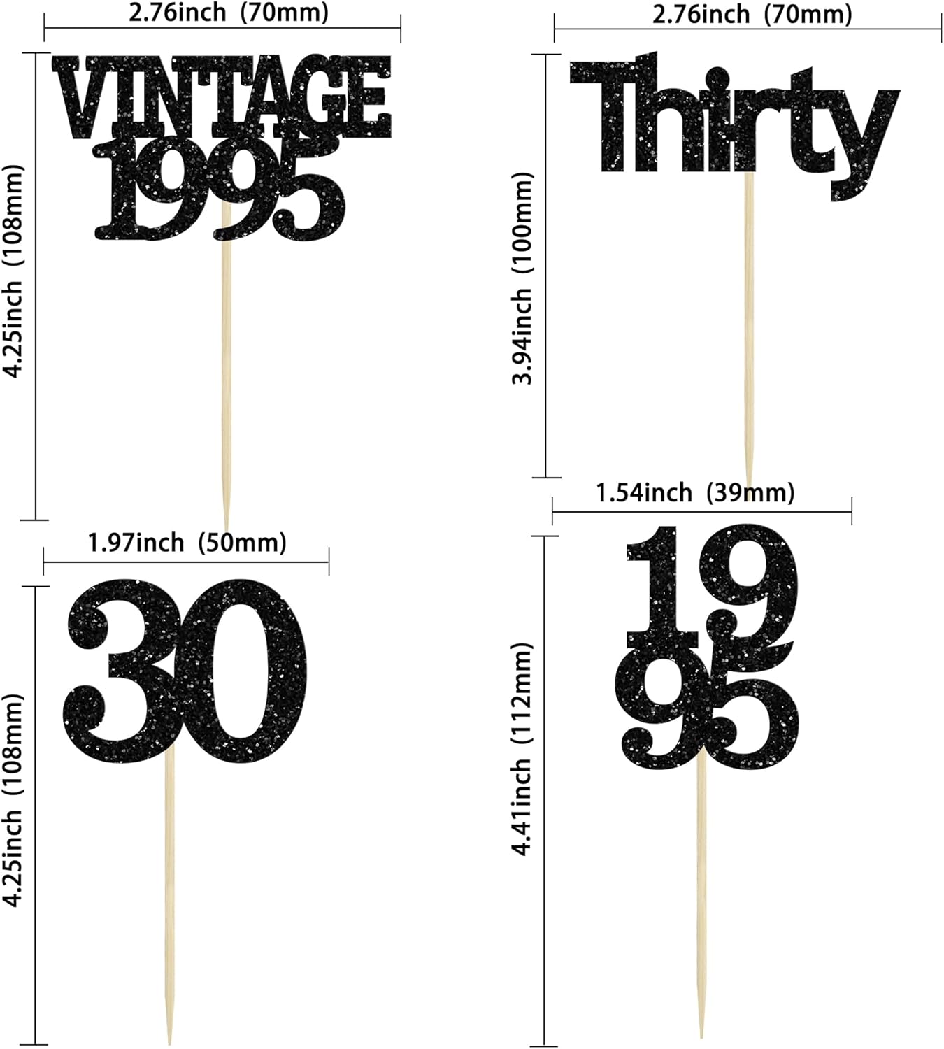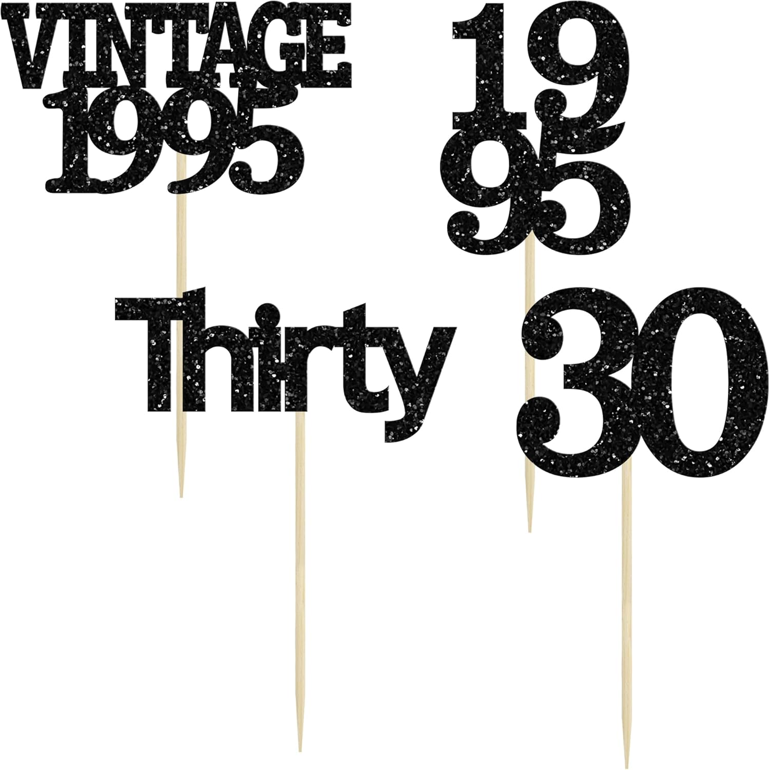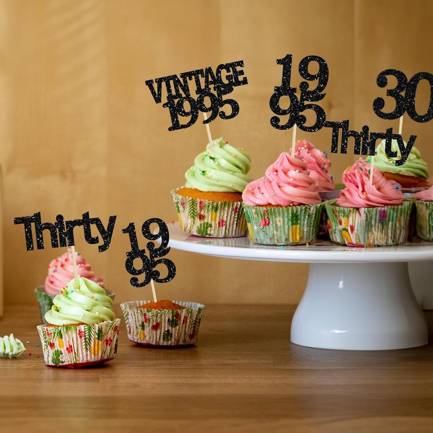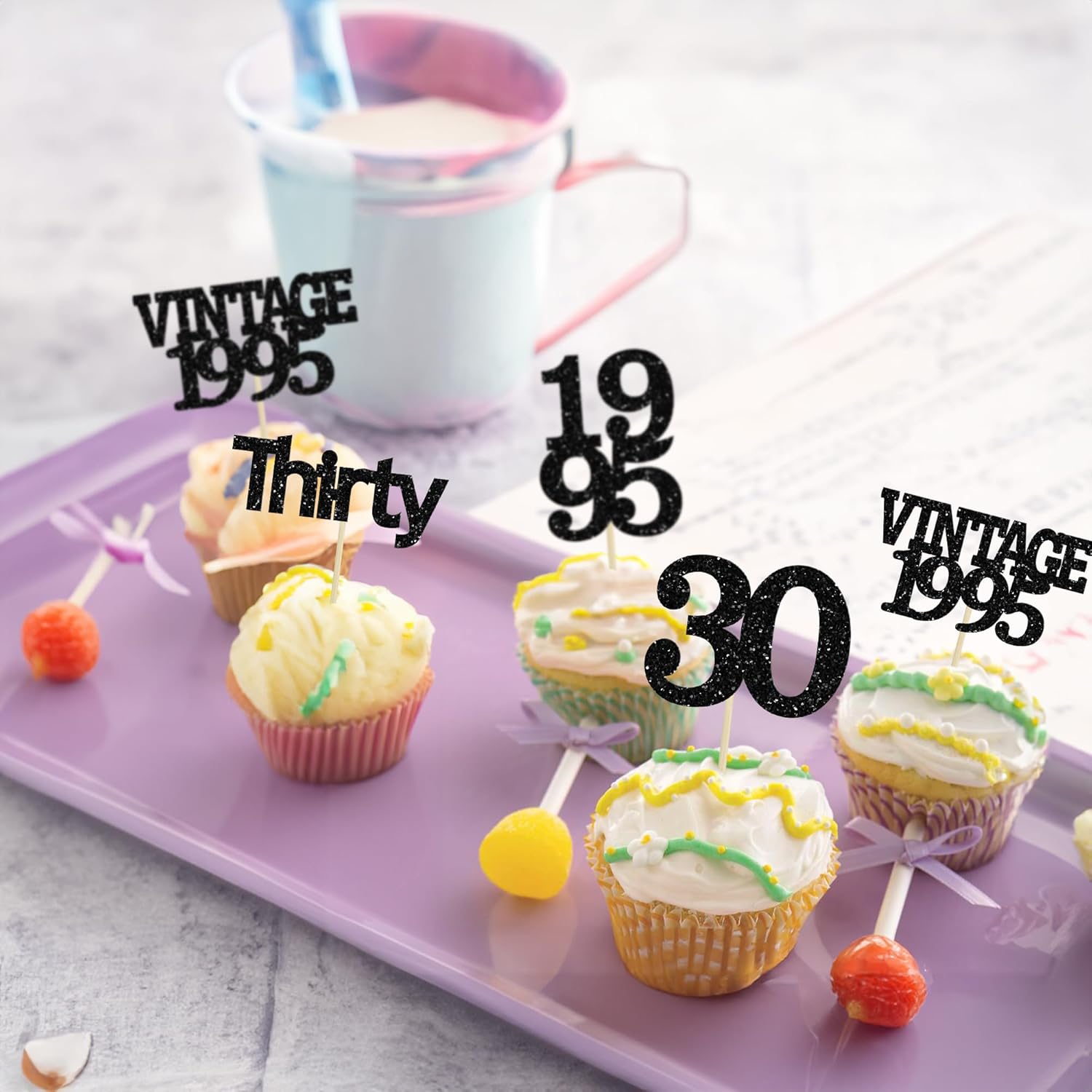 Gyufise 24Pcs Vintage 1995 Cupcake Toppers Cheers to 30 Fabulous Thirty Cupcake Picks Decorations for 30th Birthday Wedding Anniversary Party Supplies Black