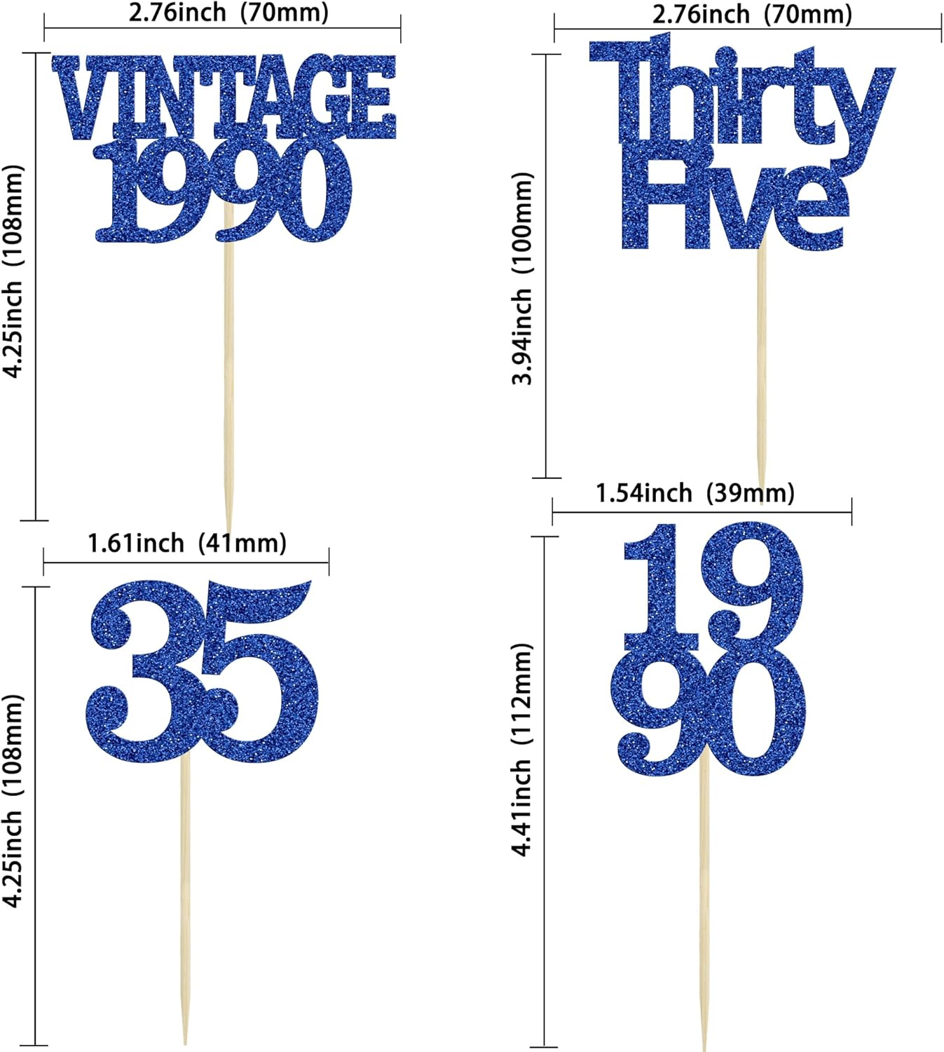 Gyufise 24Pcs Vintage 1990 Cupcake Toppers Glitter Cheers to 35 Fabulous Thirty Five Cupcake Picks 35th Birthday Wedding Anniversary Party Cake Decorations Supplies Deep Blue