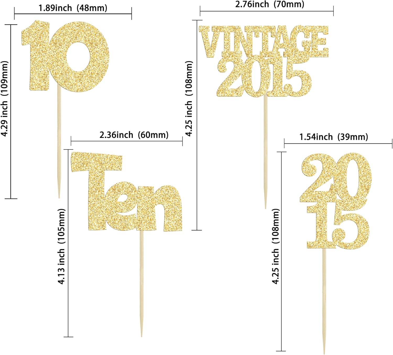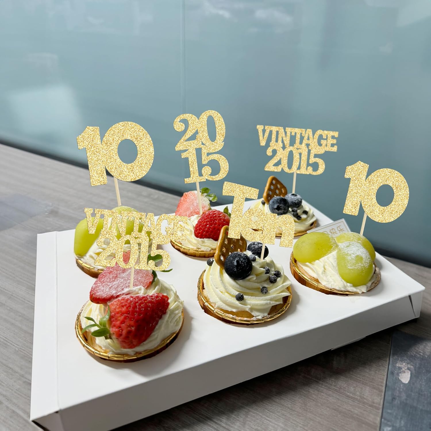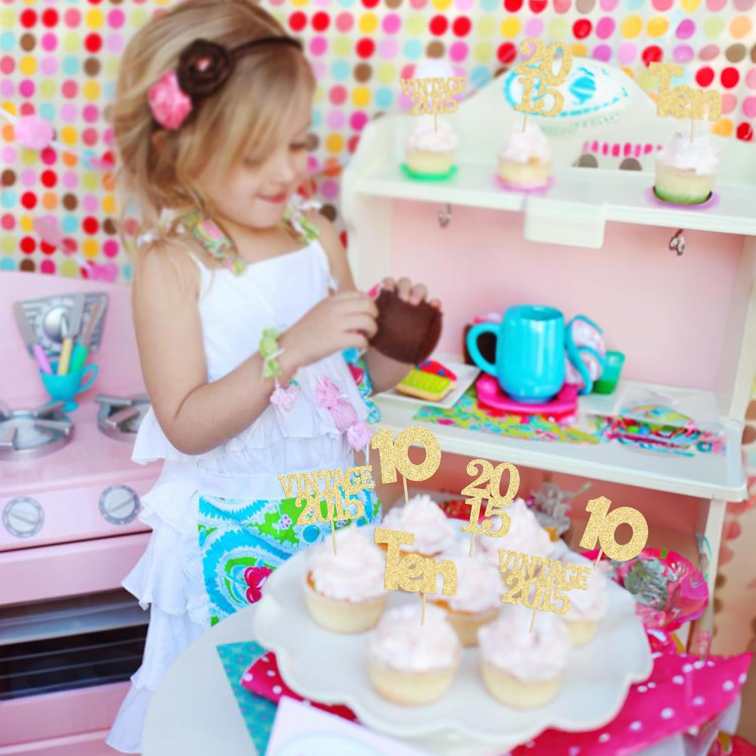 Gyufise 24Pcs Double Digits 10 Cupcake Toppers Glitter Ten Vintage 2015 10th Birthday Cupcake Picks Hello 10 Years Birthday Cake Decorations for Happy 10th Birthday Anniversary Party Supplies Gold
