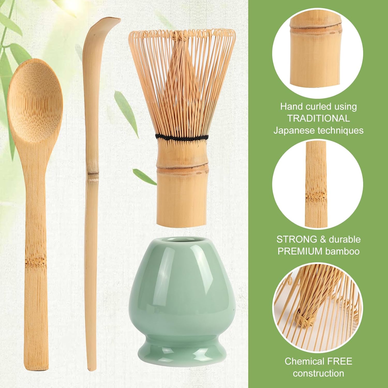 - [Japanese Matcha Whisk Set 4pcs]:This Matcha Set Contains A Handcrafted Bamboo Whisk(Chasen),Wooden Scoop,Matcha Spoon And Ceramic Whisk Holder, Making It An Ideal Matcha Starter Kit For Tea Lovers