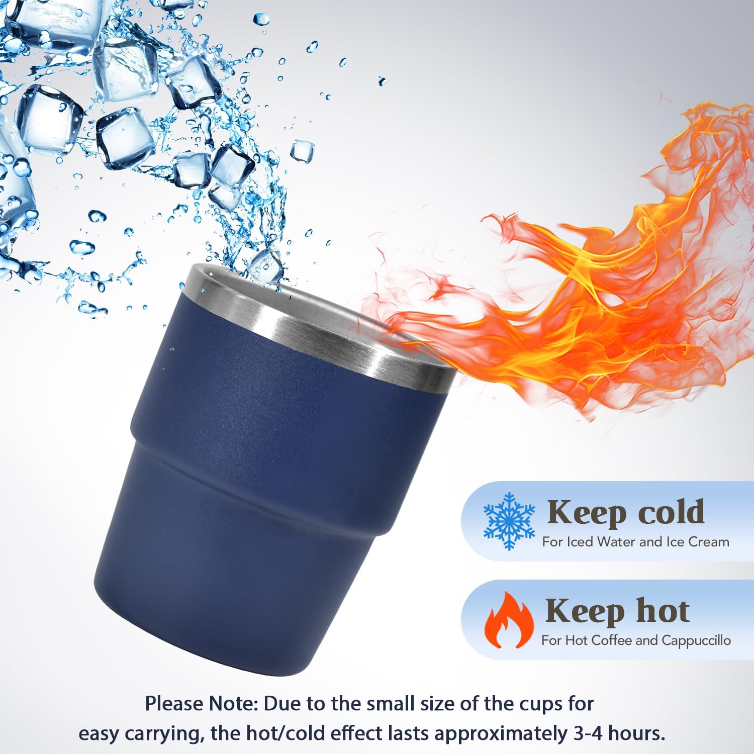 - DOUBLE WALL STAINLESS STEEL: Our espresso cups are made from double wall 18/8 stainless steel, vacuum insulated. Compared to ceramic lining, stainless steel lining are more durable, anti-scald, odourless, not break easily, and better at retaining hot or cold. Whether it's a hot coffee or an iced coke, this small cup is up to the task!