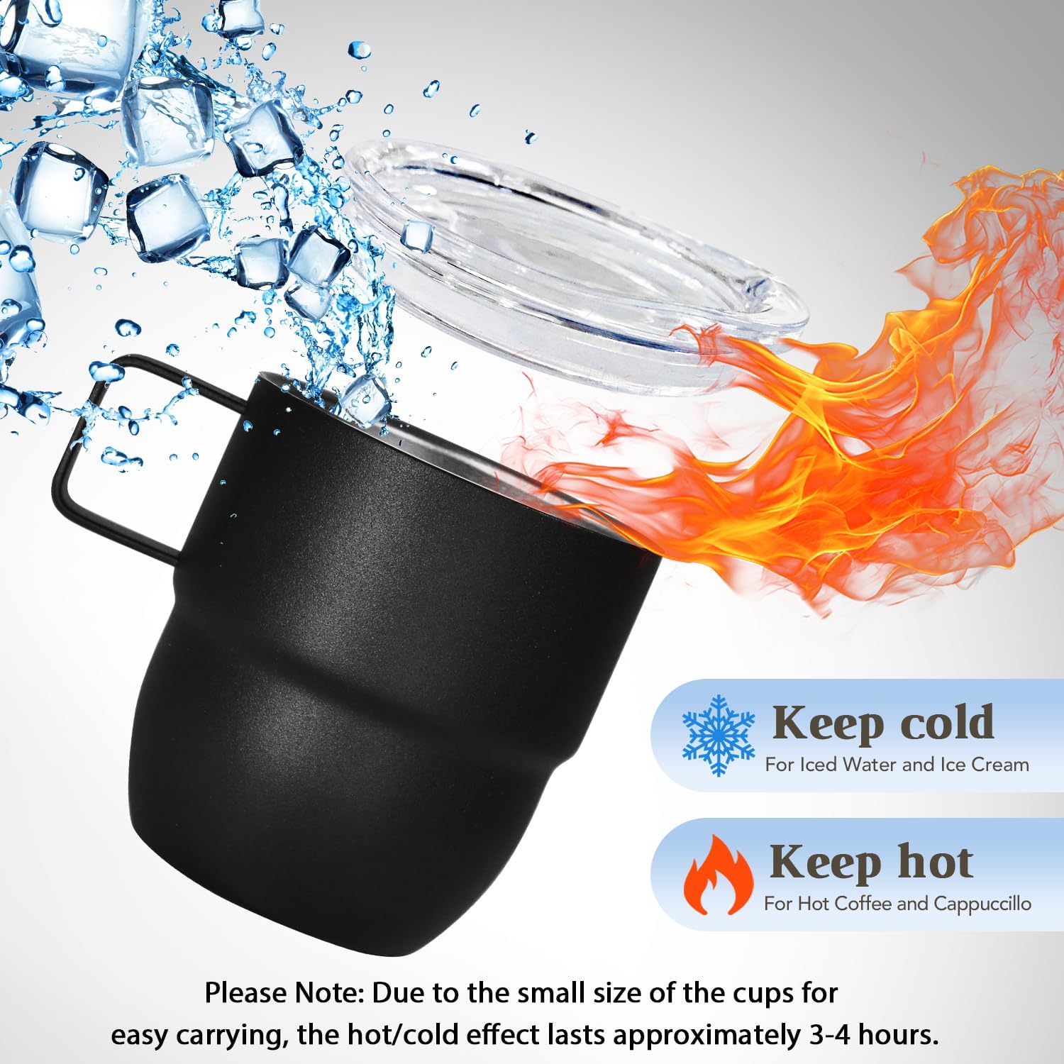 - DOUBLE WALL STAINLESS STEEL: Our espresso cups are made from double wall 18/8 stainless steel, vacuum insulated. Compared to ceramic lining, stainless steel lining are more durable, anti-scald, odourless, not break easily, and better at retaining hot or cold. Whether it's a hot coffee or an iced coke, this small cup is up to the task!(Please Note: Due to the small size of the cups for easy carrying, the hot/cold effect lasts approximately 3-4 hours.)