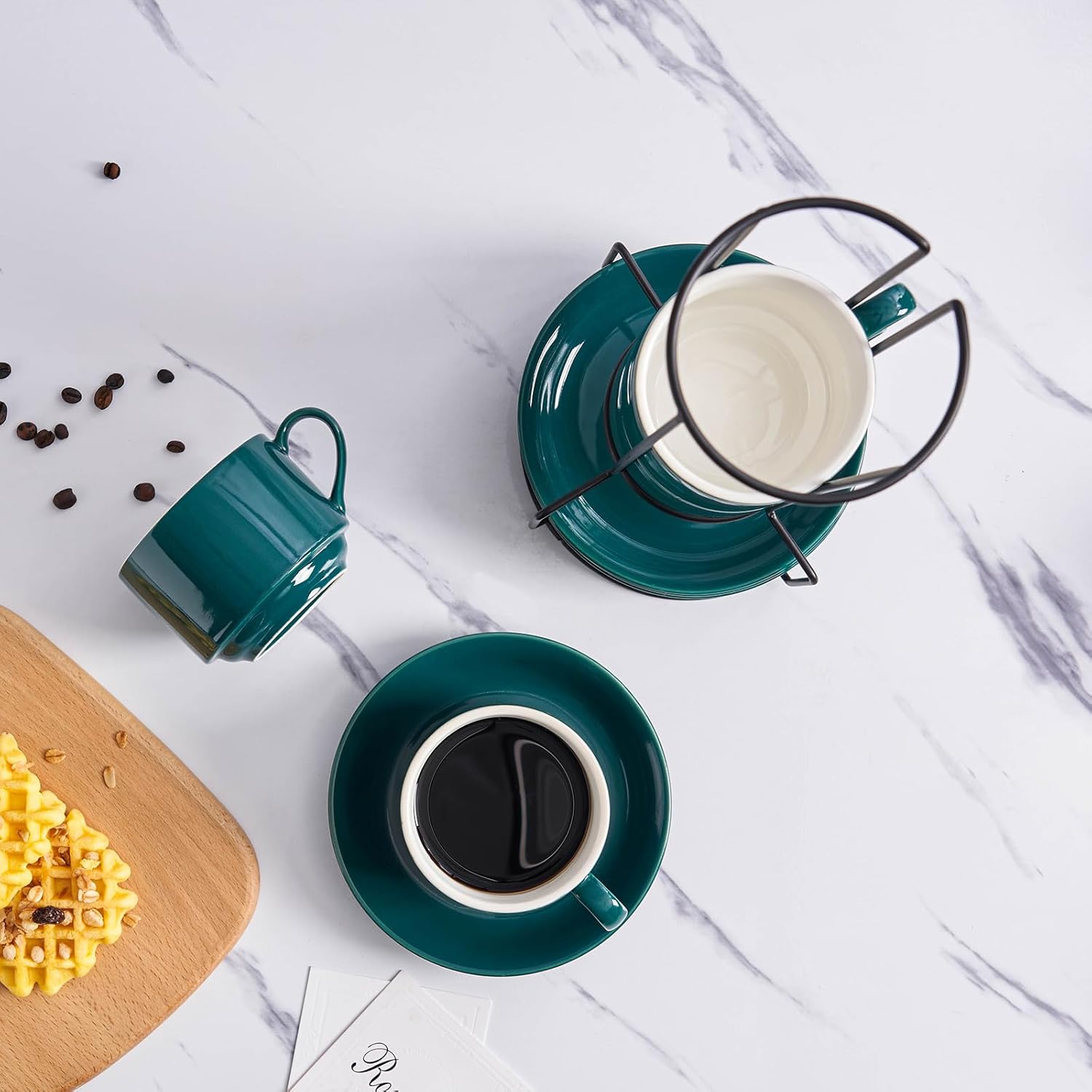 YOLIFE 8oz Porcelain Stackable Cappuccino Cups with Saucers and Metal Stand Set of 4, Coffee cups for Espresso, Specialty Coffee Drinks, Latte, Americano and Tea - Green