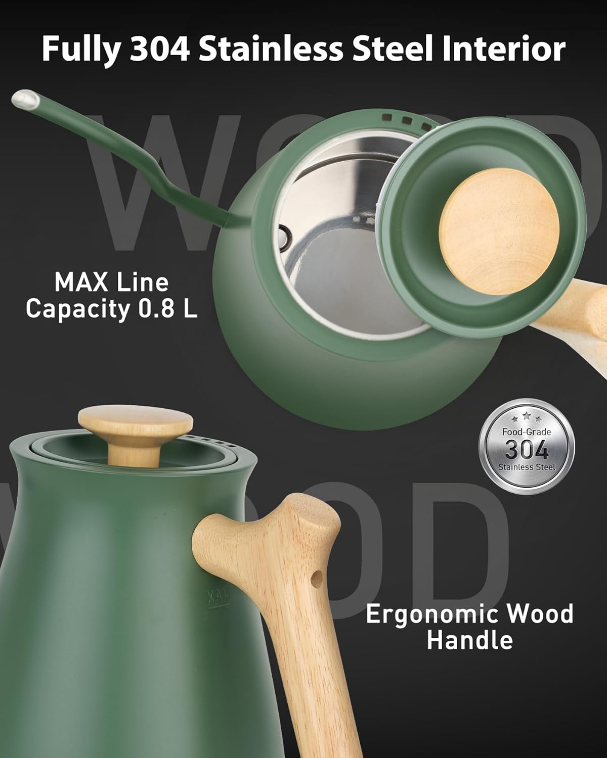 - Engineered for Enduring Quality: 100% Stainless steel interior, body, and lid, this gooseneck kettle is built to handle years of heavy daily use; Ergonomic wooden handle with heat insulation, offering exceptional strength and long-lasting performance