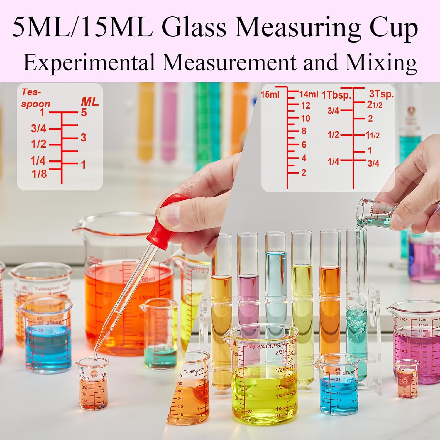- Complete Measuring Beaker Set – Includes 7 glass beaker measuring cups: 1 tsp (5ml), 1 tbsp (15ml), 1oz (30ml), 2oz (60ml), 4oz (120ml), 5oz (150ml), and 8oz (250ml), covering all baking, cooking, and drink preparation needs