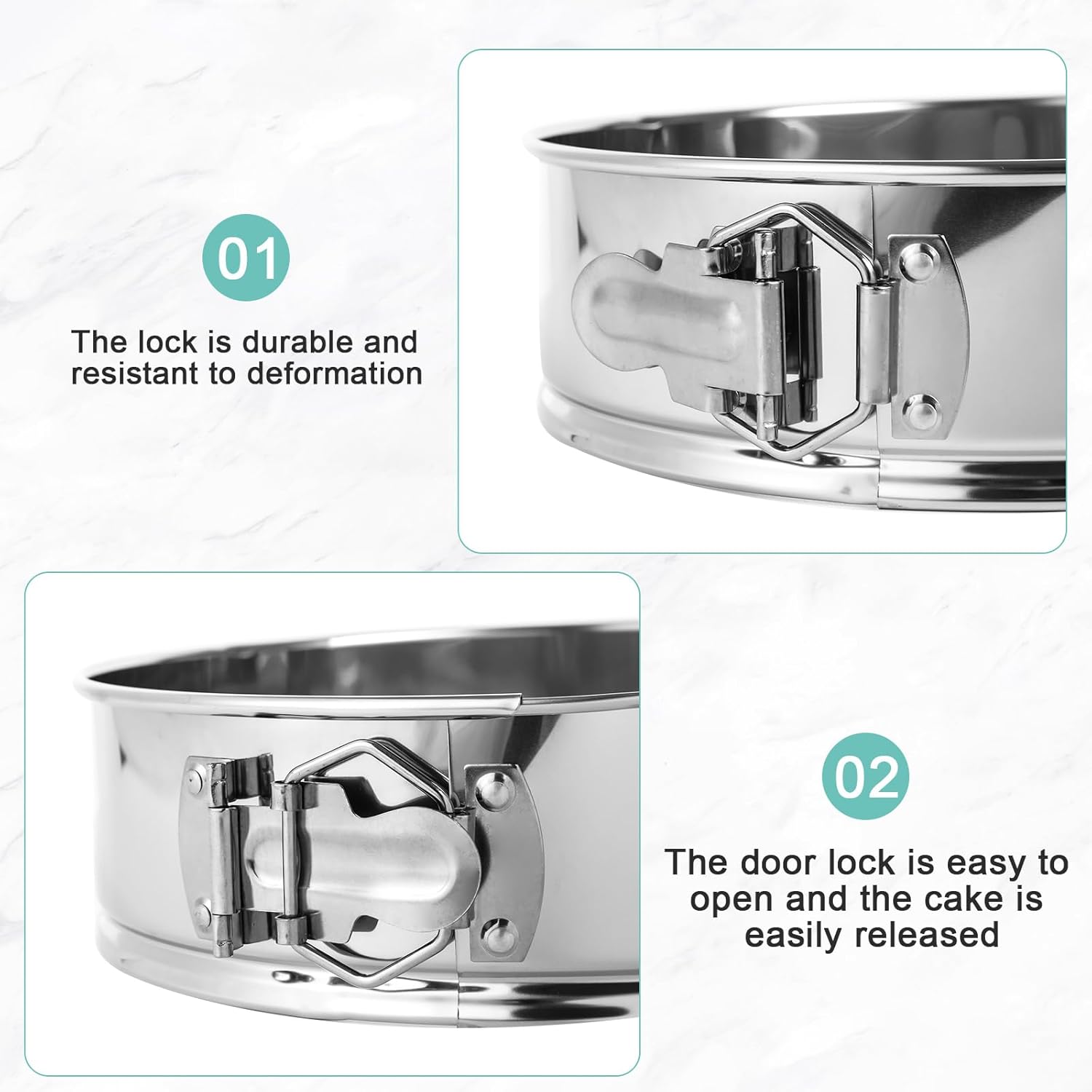 - Secure Locking Mechanism: The springform design features a reliable locking mechanism that firmly holds the sides of the pan, It's easy to open and close, allowing for effortless removal of your baked creations without damaging their shape.