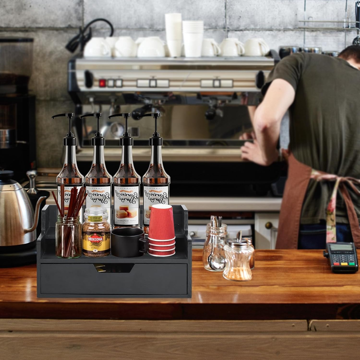 - ☕【Spacious Storage with Drawer】Our 3-tier coffee syrup organizer can stand 8 syrup bottles and has one pull-out drawer that can store 25 coffee capsules. Stepped design allows for neat placement and easy access to your favorite syrup. Ideal for use on home kitchen counters, office lounge areas, this coffee station organizer allows coffee or tea to be easily organized and replenished as needed.