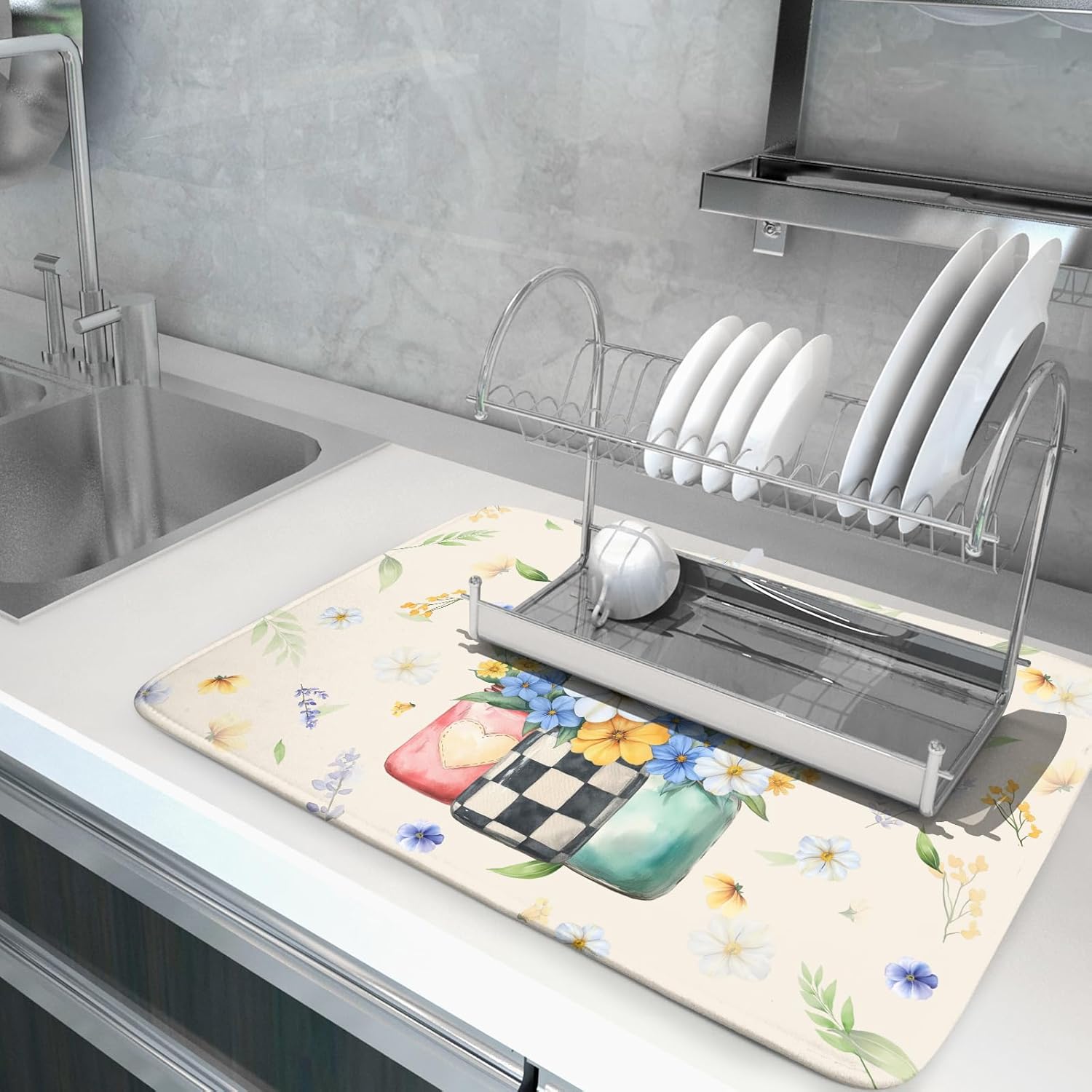 Giwawa Spring Flower Vases Dish Drying Mat for Countertop, 18"x24" Watercolor Floral Mason Jar Dish Drainer Mats, Wildflower Botanical Fast Dry Microfiber Large Dish Drying Pad Decoration