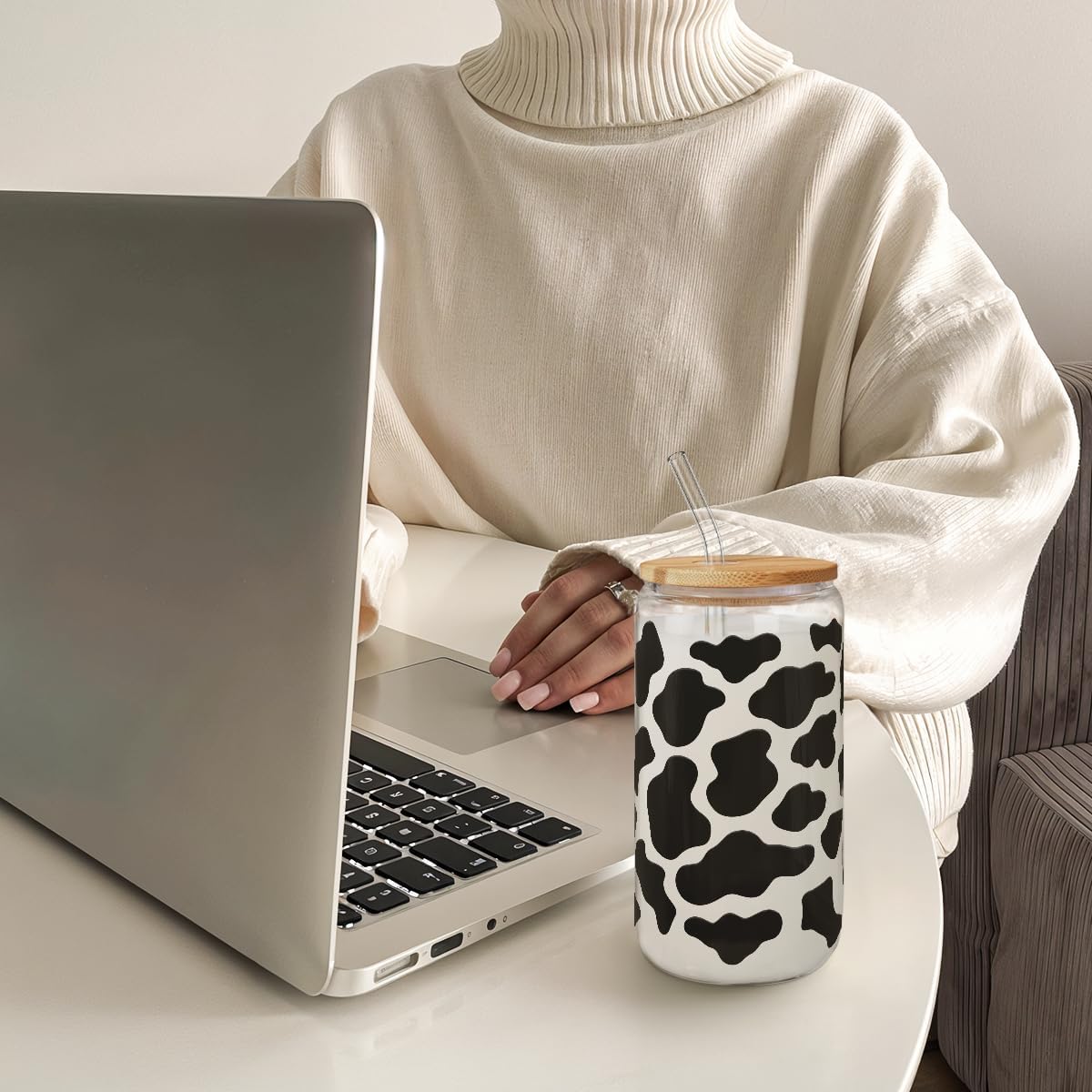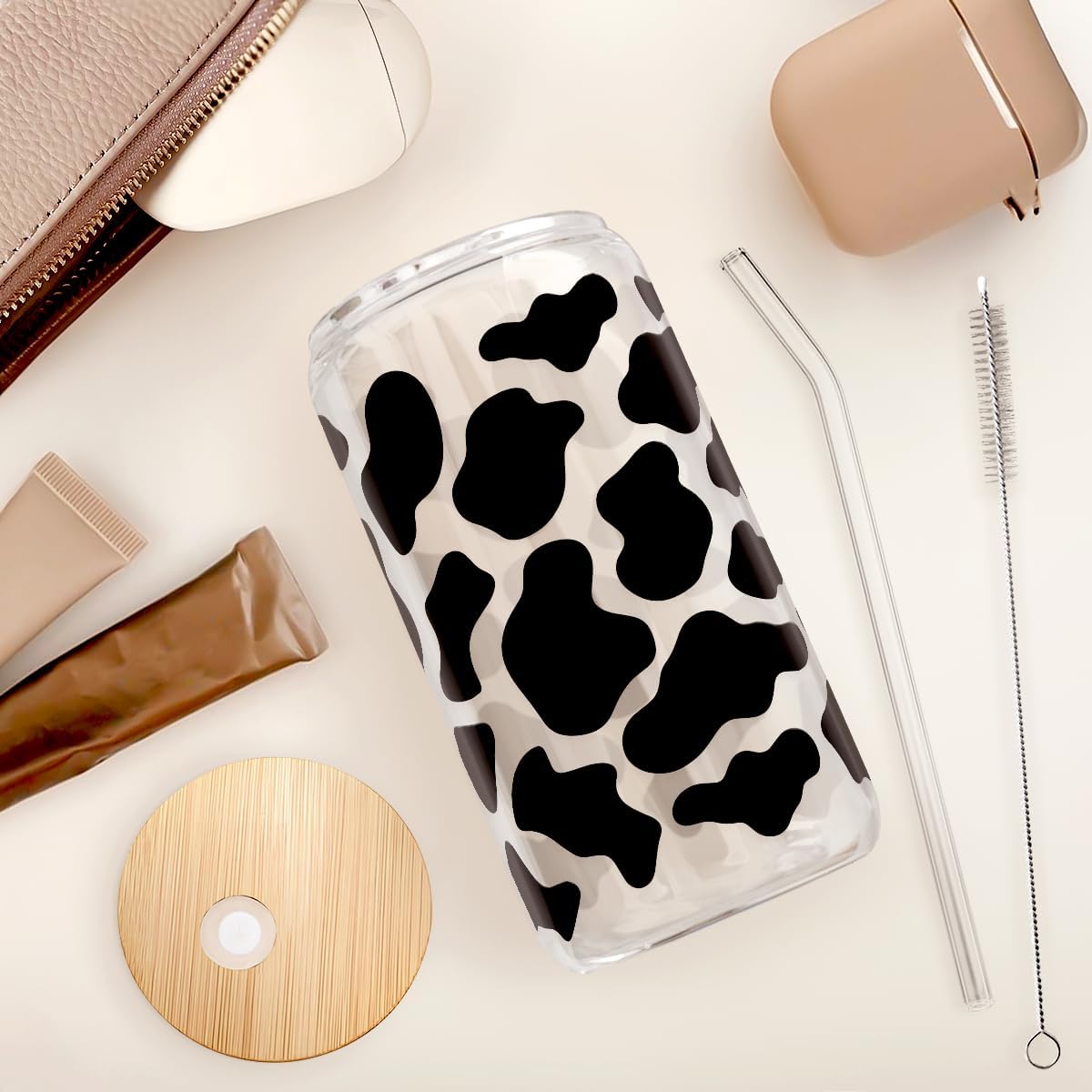 SANDJEST Cow Glass Can, Cow Prints Cup with Lid & Straw, Iced Coffee Aesthetic Cups, Idea Gift for Christmas Birthday Mother Day, Gifts for Women, 16oz