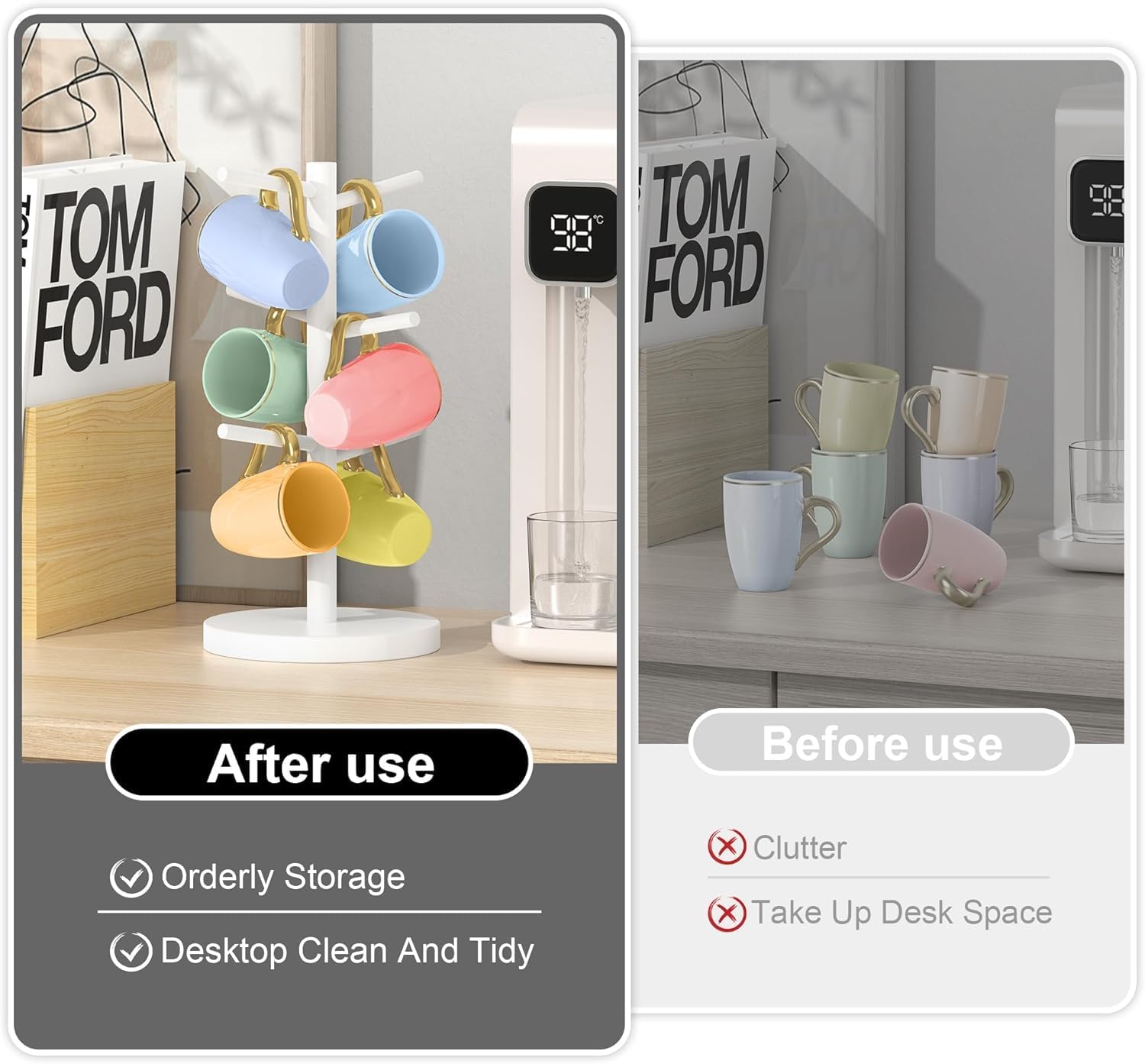- 【Save Kitchen Space】This Sturdy mug display stand could be used for storing, displaying, drying mugs, glass, cups, and bottles, saving space for kitchen counter, pantries or cabinets