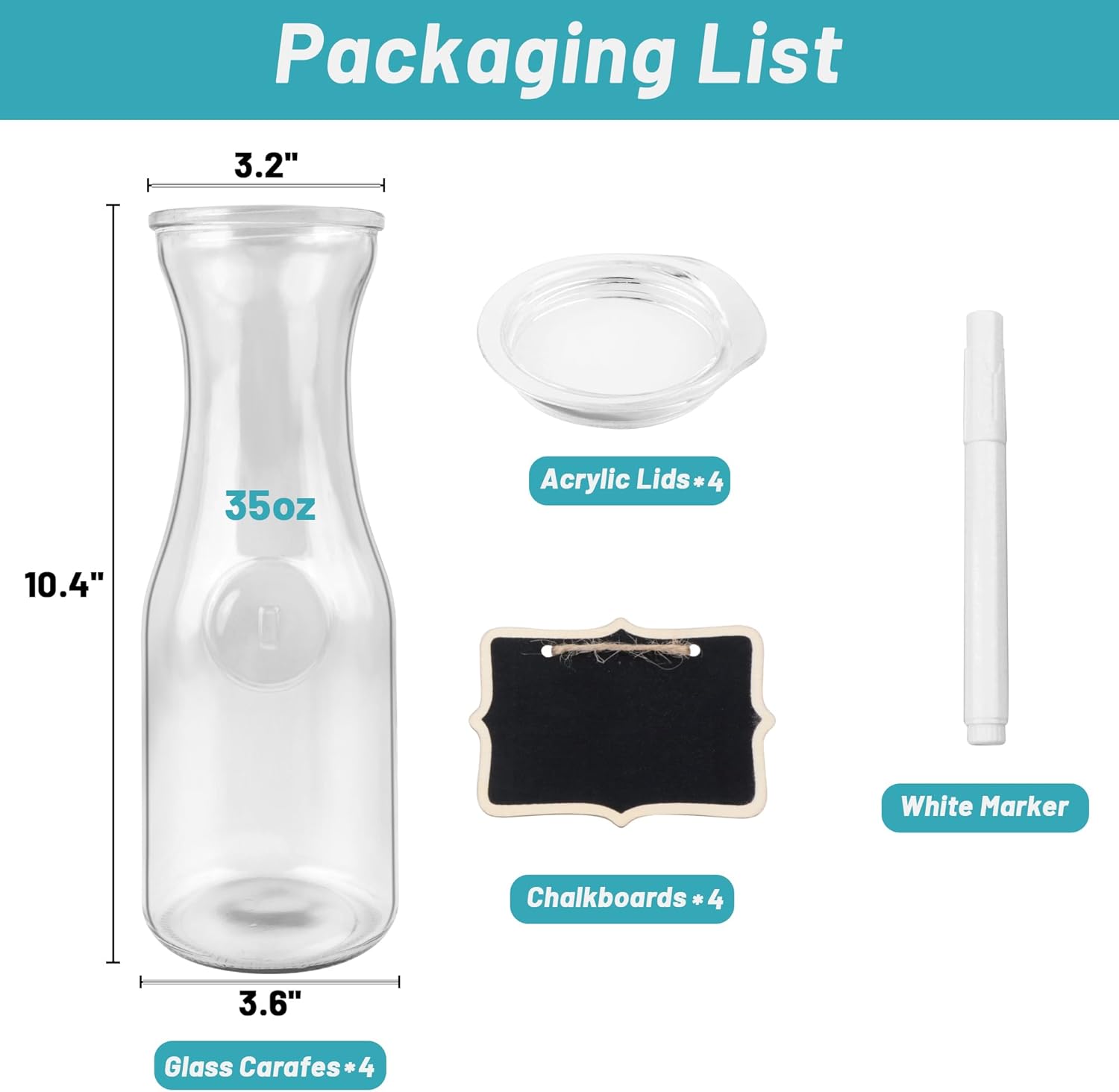 Glass Carafe with Acrylic Lid,35 Oz Beverage Dispensers Carafe,Mimosa Bar Supplies,Clear Glass Pitcher with Name Labels for Iced Tea,Coffee,Juice(Set of 4)